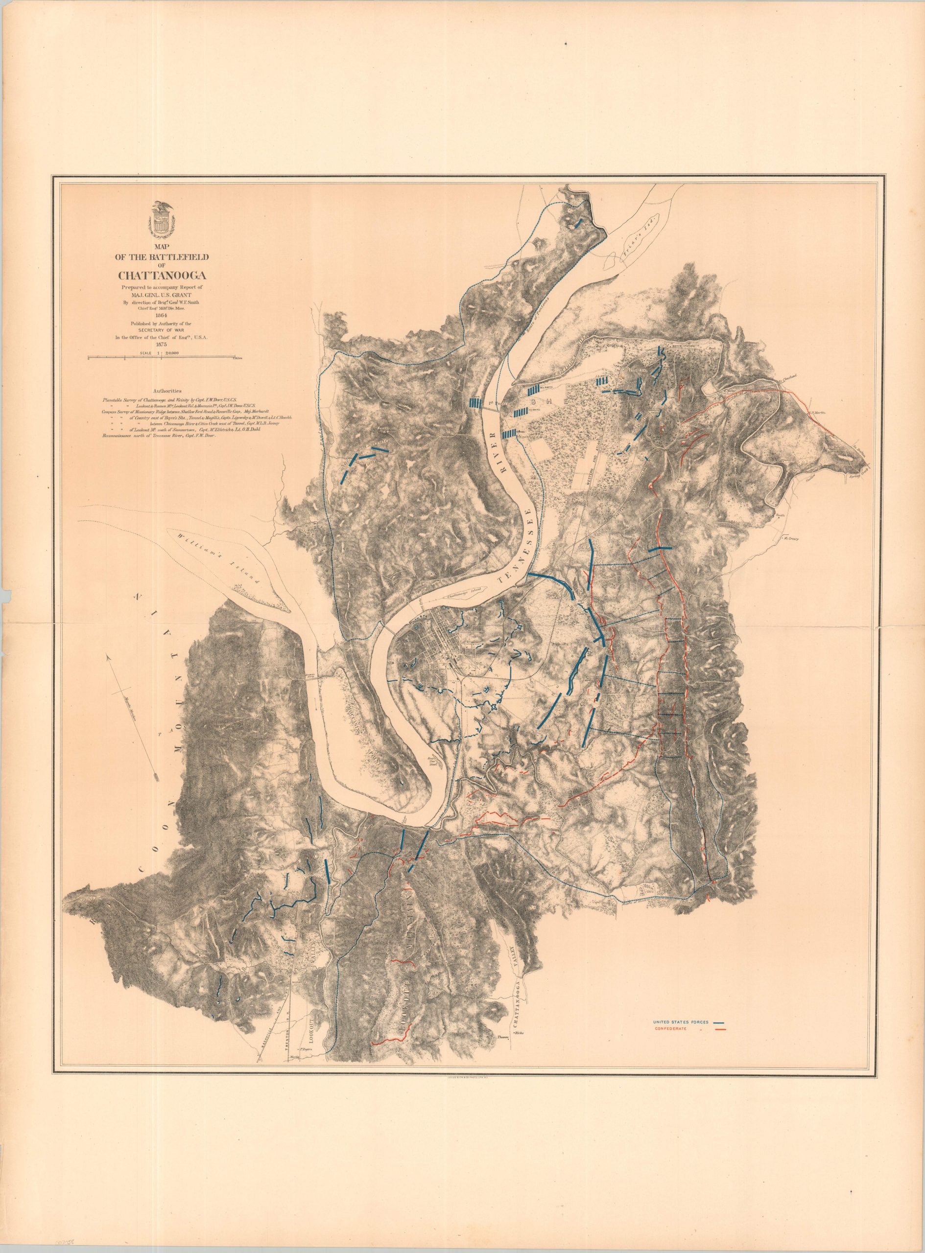 This battle plan of the Chattanooga Campaign depicts the terrain and general troop movements that played a pivotal role in shaping the outcome of the conflict in the Western Theater. It was drawn under the authority of Brigadier General William Farr Smith and published in 1875 by the U.S. War Department. The pivotal city is located in the center, surrounded by Union defenses (dark blue) and Rebel attackers (red). Relief is shown in hachure and a variety of strategic features are shown, including railroads, prominent landmarks, and even individual buildings.