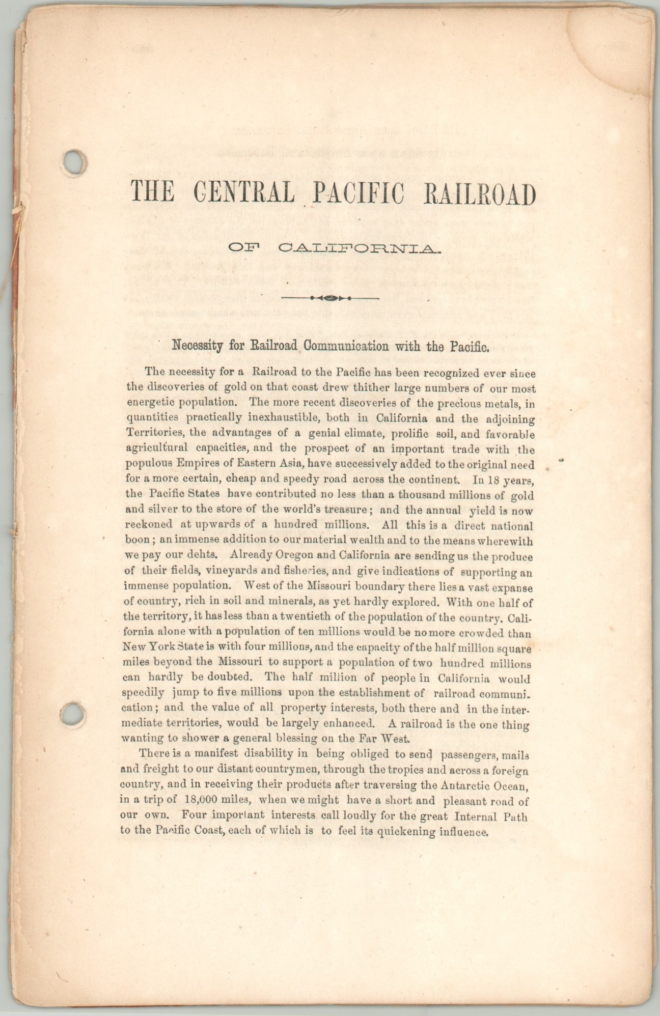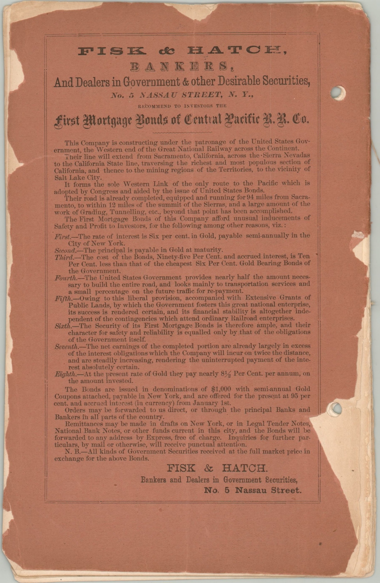 This version was issued with an accompanying pamphlet printed in New York by Hosford & Sons. Its 20 double-sided pages, apparently written by the banking firm Fisk & Hatch, was designed to draw economic investment through the sale of company bonds, backed by the U.S. government. Various section headers highlight the different avenues of persuasion; It’s Effect Upon Agricultural Expansion, Important Bearing on the Trade with Eastern Asia, and the Railroad as a Military and Civilizing Agency to name just a few.