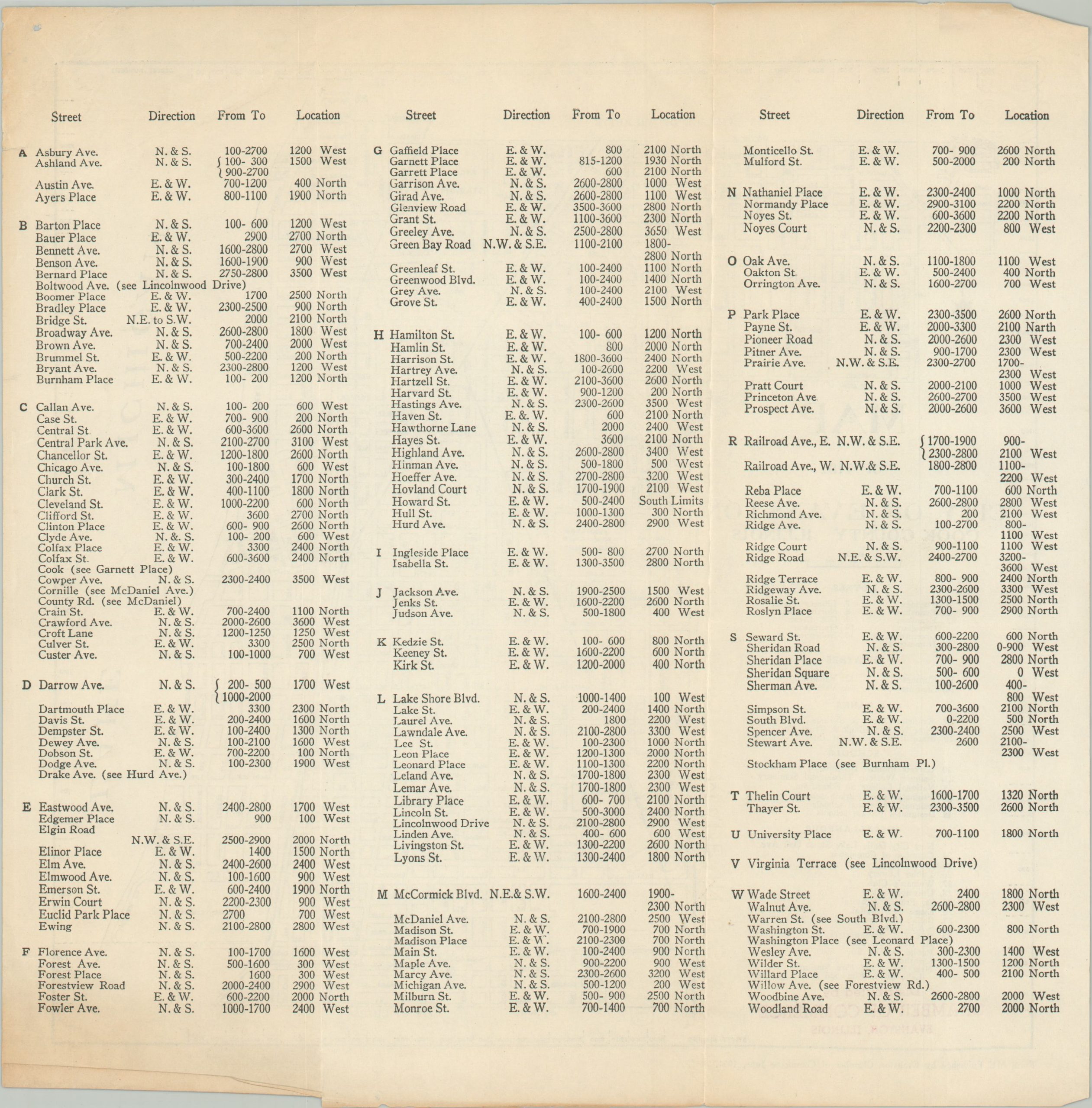 Thirty-six different locations of interest are identified; including hotels, theaters, banks, schools (public, parochial, and private), and more. Cavalry Cemetery, the campus of Northwestern University, Dyche Stadium, and the Evanston Township High School are also labeled. Railroads are noted, including the iconic interurban North Shore Line. Alphabetical street index on the verso.