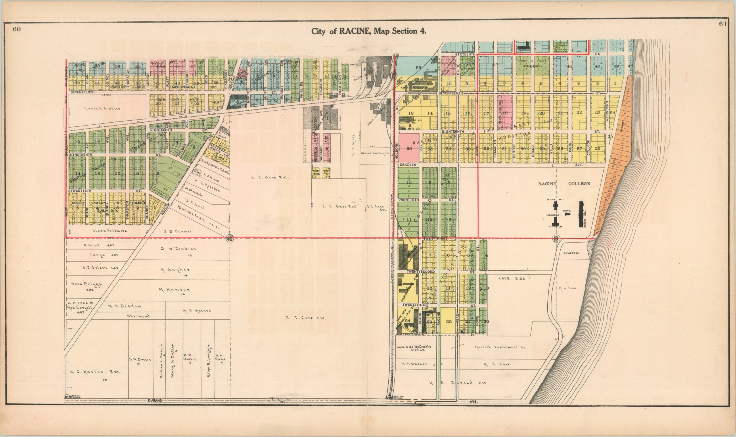 This large, four sheet plat map of the city of Racine was published by Hennessey & Co. as part of their atlas of Racine and Kenosha counties in 1908. Vivid colors differentiate between separate additions, while finely detailed text provides ownership information on individual plots. Important buildings, parks and railroads are also shown, while wards are separated by bold red outline. Racine at this time was a city divided between agriculture and industry; as evidenced by the dairies, stockyards and farms on the outskirts of the city and the factories, mills and warehouses along the rivers and rail lines. It was also largely a town of immigrants, as can be seen in many of the property owner’s names listed on the map.