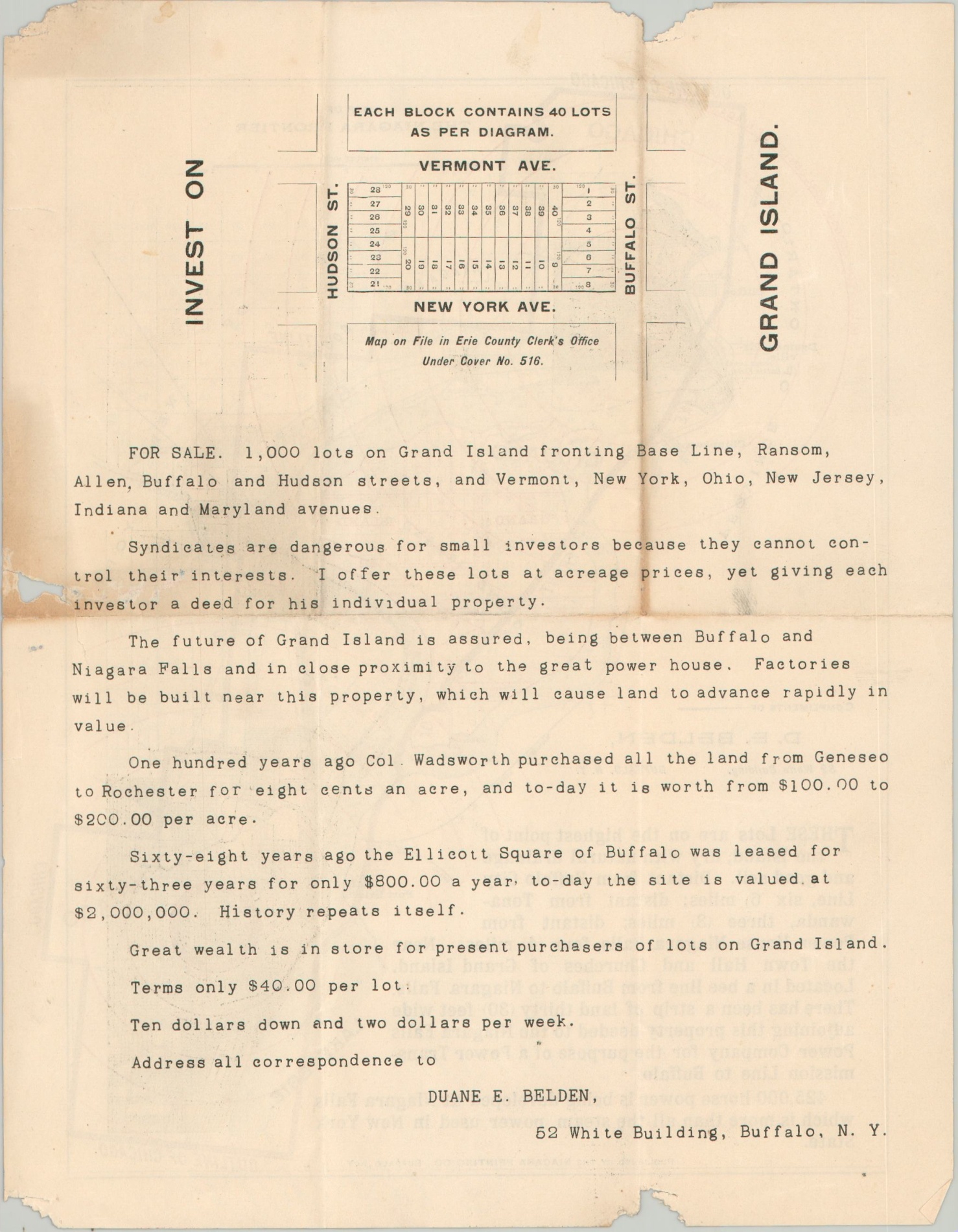 The map was published in the early 20th century by Duane Belden, owner and subdivider of 1,000 lots on Grand Island. The verso includes further details on the terms and conditions and assures the reader that the future of the island community is a bright one, due in part to the electricity-producing capabilities of the Niagara Falls Power Company;