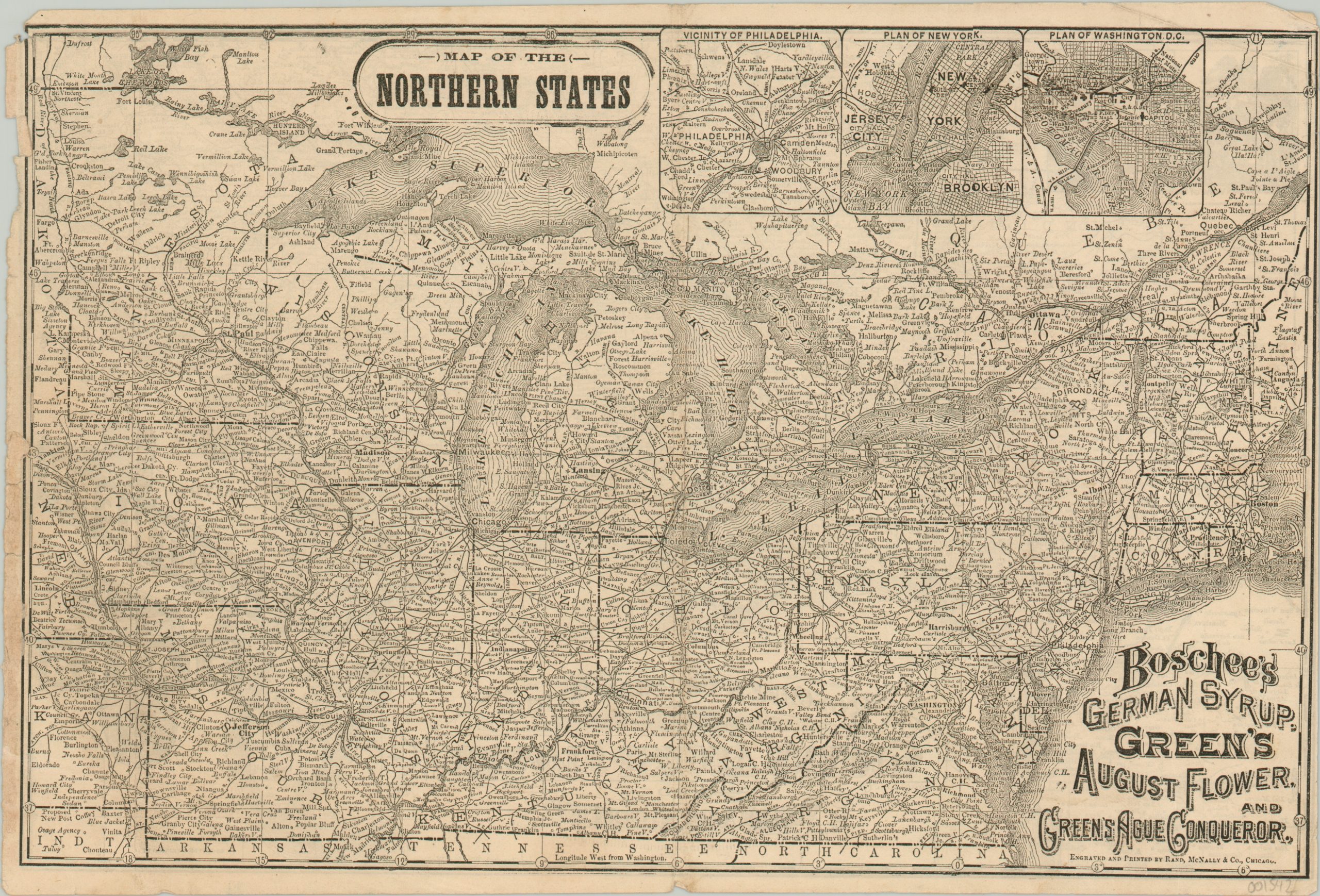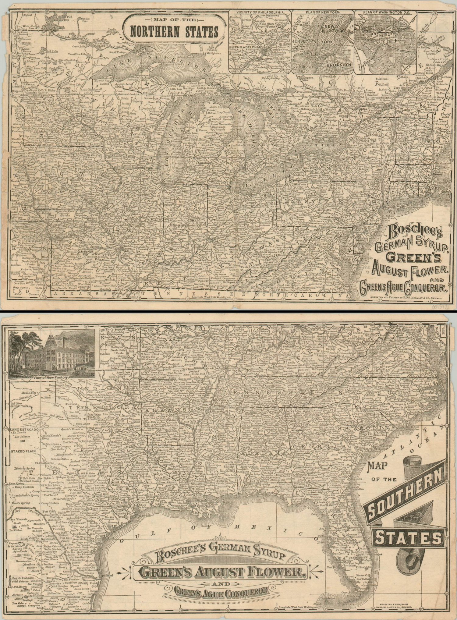 This fascinating postbellum map of the United States presents the country split across lines that closely mimic the conflict fought less than two decades prior to publication. One side shows the northern states from Iowa east and Kentucky north, and includes three inset maps of Philadelphia, New York, and Washington D.C. The verso shows the southern states, including Texas, Indian Territory, and parts of Mexico. In the upper left is a profile view of the new factory, where presumably Boschee’s German Syrup, Green’s August Flower, and Green’s Ague Conqueror are produced.
