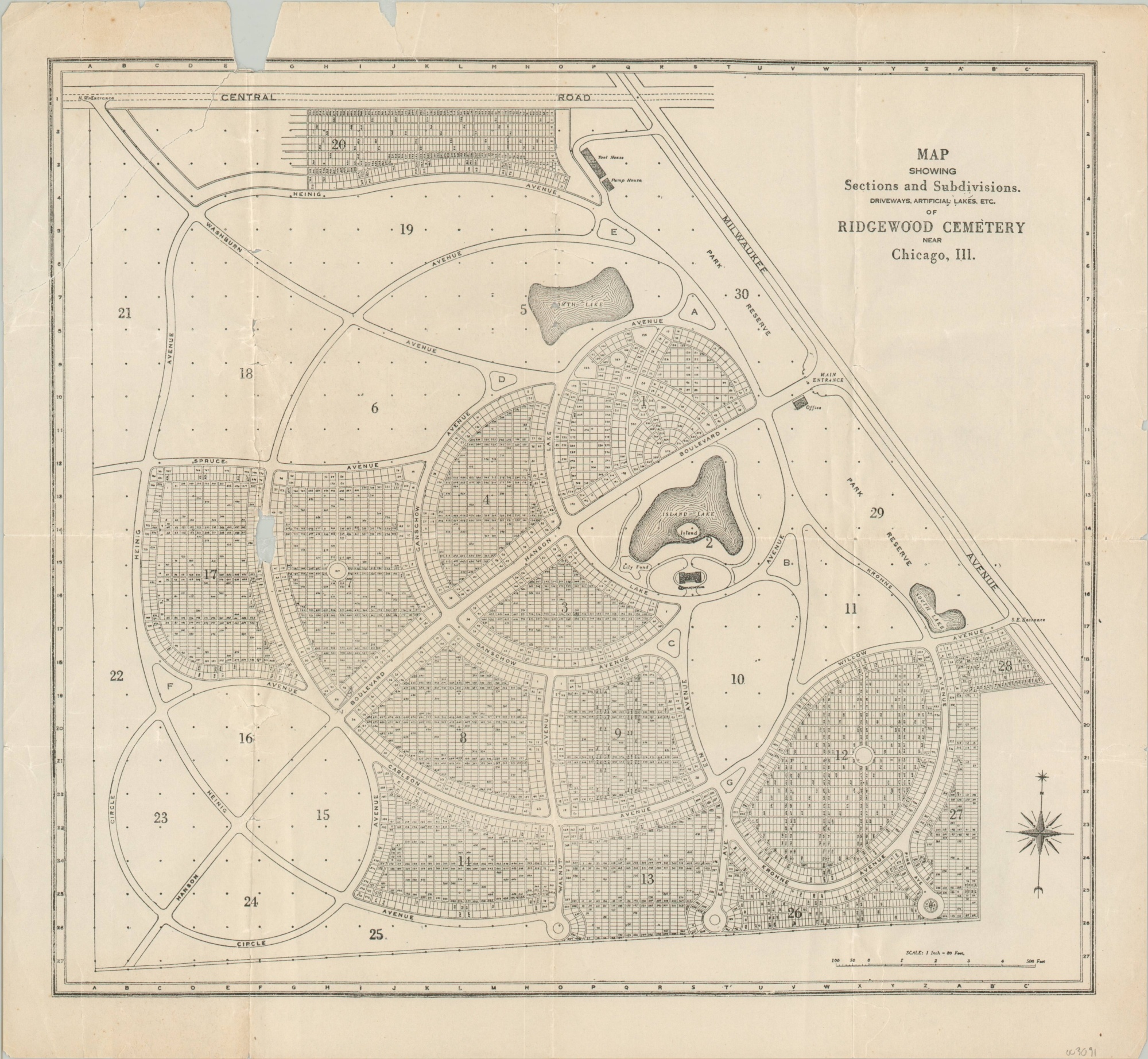 Map Showing Sections and Subdivisions, Driveways, Artificial Lakes, etc. of Ridgewood Cemetery
