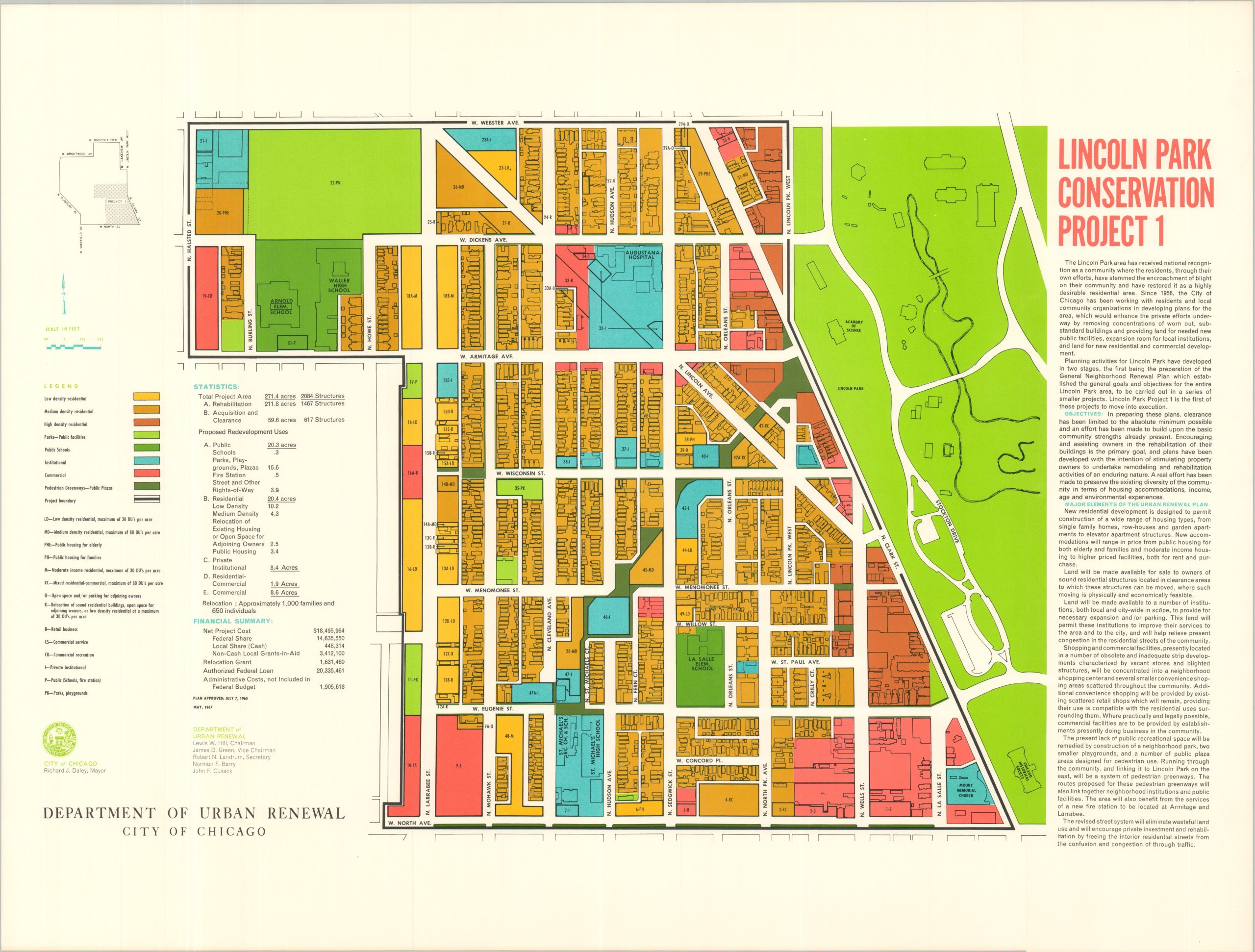 This collection of maps was issued by Chicago’s Department of Urban Renewal in 1967 to highlight the organization’s ongoing efforts to eliminate blight and improve living conditions across the city. A series of colorful, large-scale sheets outlines proposed conservation projects in Southeast Englewood, Lincoln Park, and the Near West Side. Two further maps of the entire city outline the various redevelopment works, established conservation areas, study areas, loan and grant areas, and more.