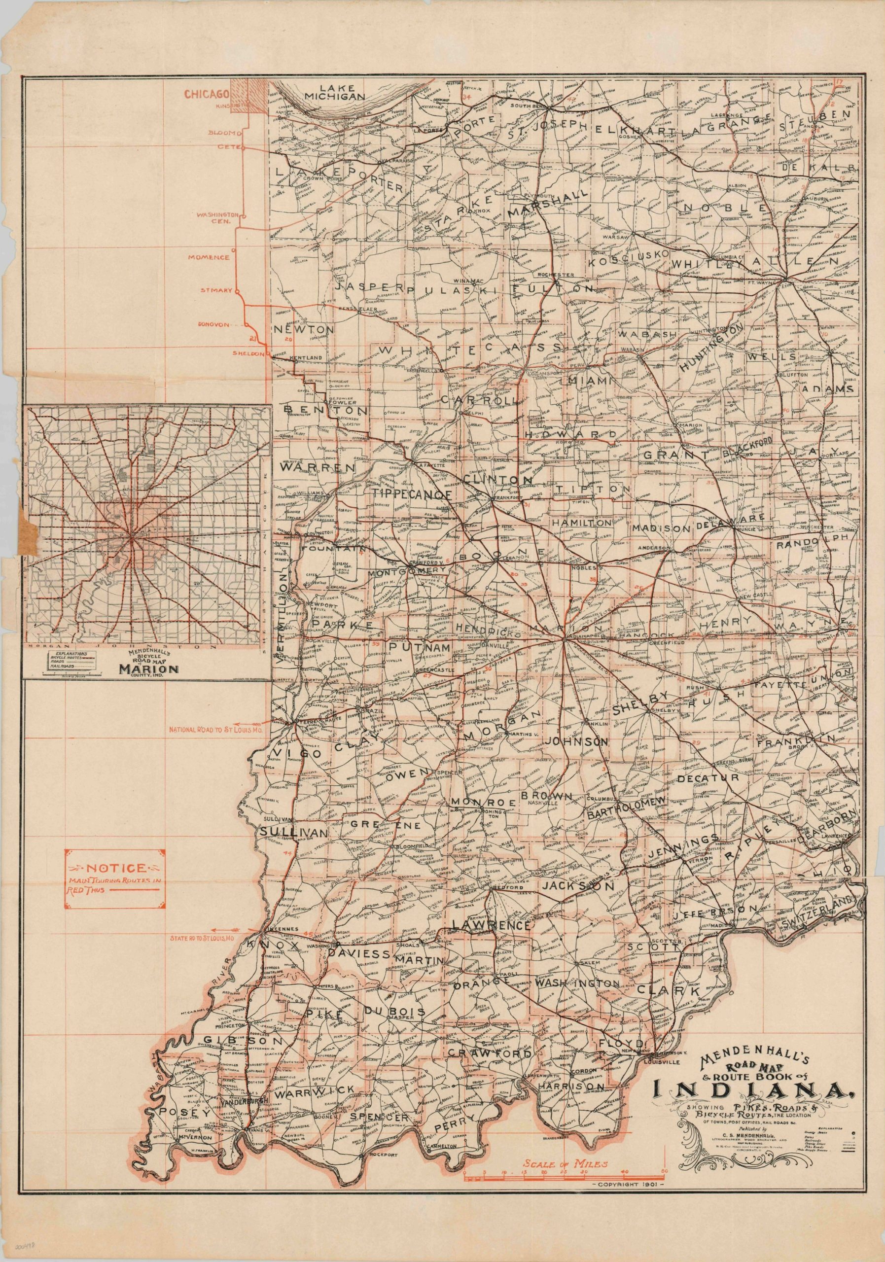 C.S. Mendenhall issued road maps of several U.S. states in the early years of the 20th century, primarily in the Midwest. Although the automobile had been invented, it was expensive and its use was not widespread. Therefore the primary consumers of these maps were bicyclists and travelers by carriage. Roads were primitive and varied greatly in quality – only two different types (pike roads and main bicycle routes) are labeled here, but later maps would list several different surfaces. Only three “main routes” are shown connecting Indiana to other states; the state road to St. Louis, the National Road to St. Louis, and a connection to the Dixie Highway leading to Chicago. An inset map of Marion county closely mimics today’s interstate maps.