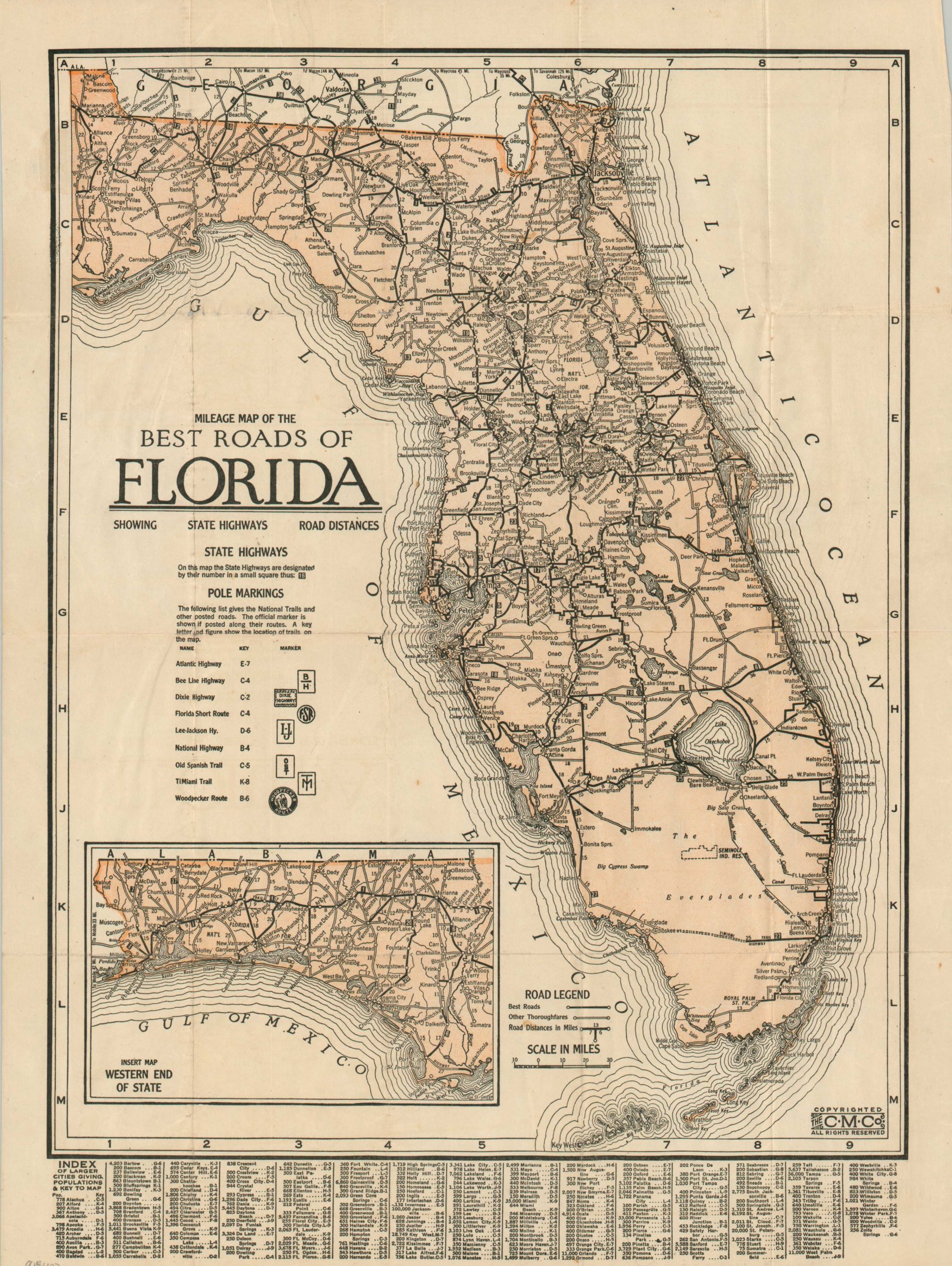 The centerfold image notes the state highways (established in 1923) and the various other named routes in operation across Florida. The latter group represents an interesting variety of private enterprises and state/municipal sponsorship. For example, the Bee-Line Highway opened in 1924 as a toll road to connect West Palm Beach to real estate developments on Lake Okeechobee. The introduction of a national numbered highway system in 1926 would make these private routes largely obsolete.