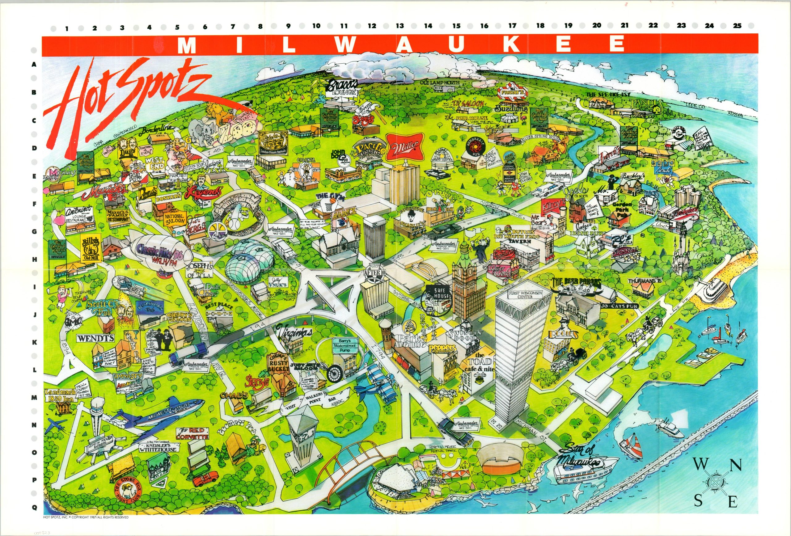 This eye-catching guide to Milwaukee provides a pictorial overview of the city’s social scene during the late 1980s. Numerous bars, restaurants, pubs, nightclubs, and lounges are illustrated and labeled throughout the image, which is oriented with northwest at the top (note Russia, China, and San Francisco just over the horizon). More family-friendly attractions include the Milwaukee County Zoo, the state fairgrounds, Milwaukee County Stadium, and the Henry Maier Festival Park along the Lake Michigan waterfront.