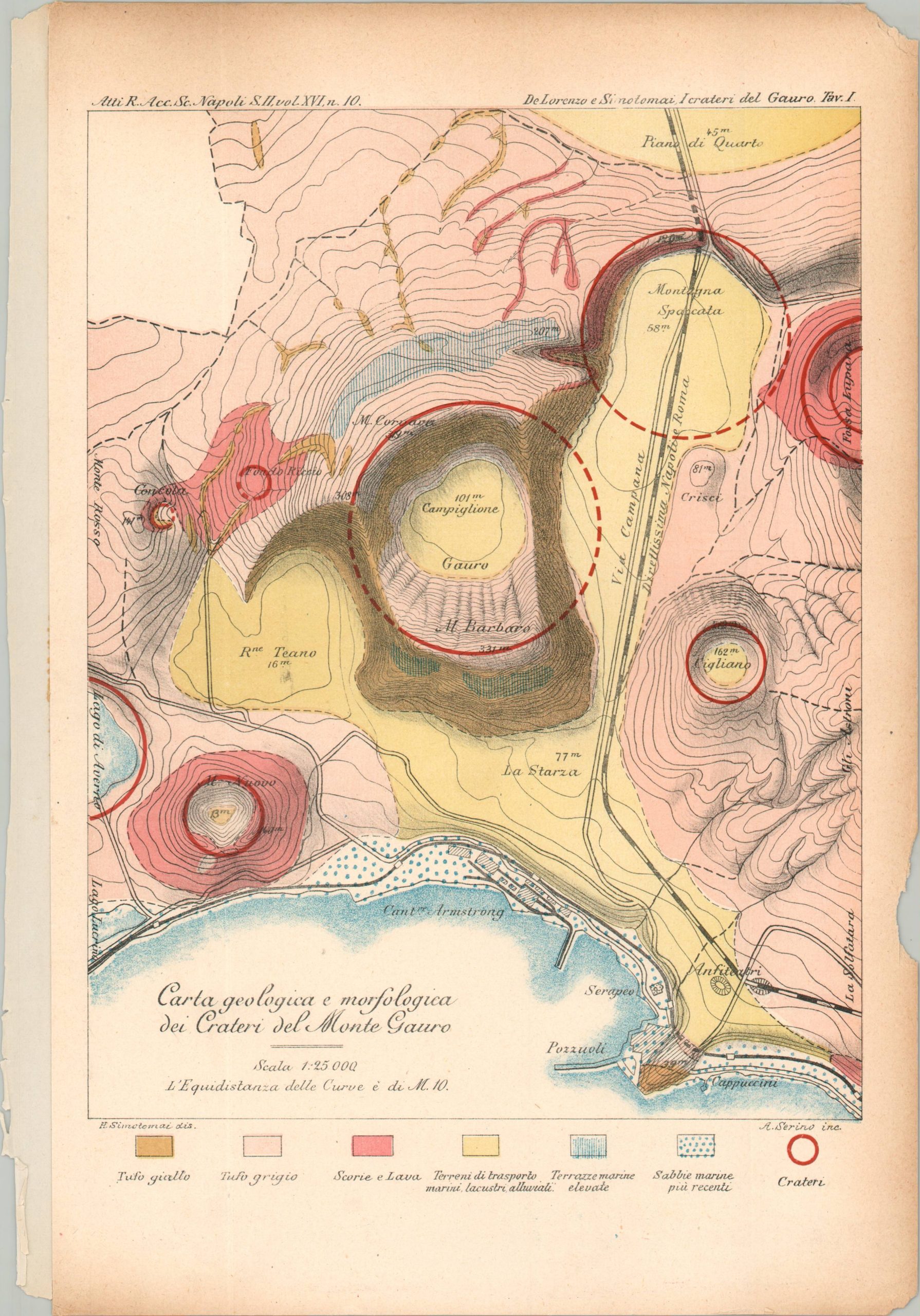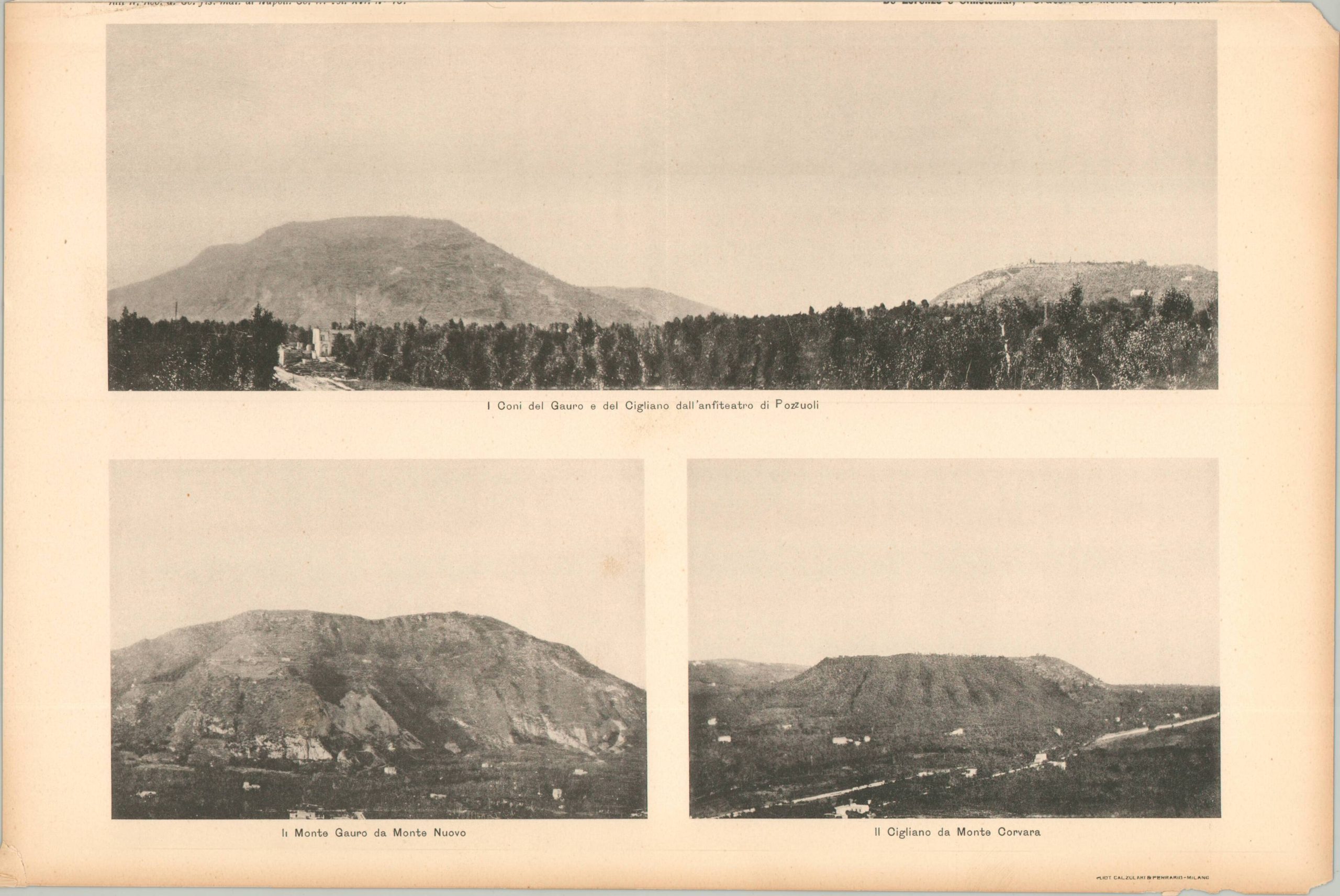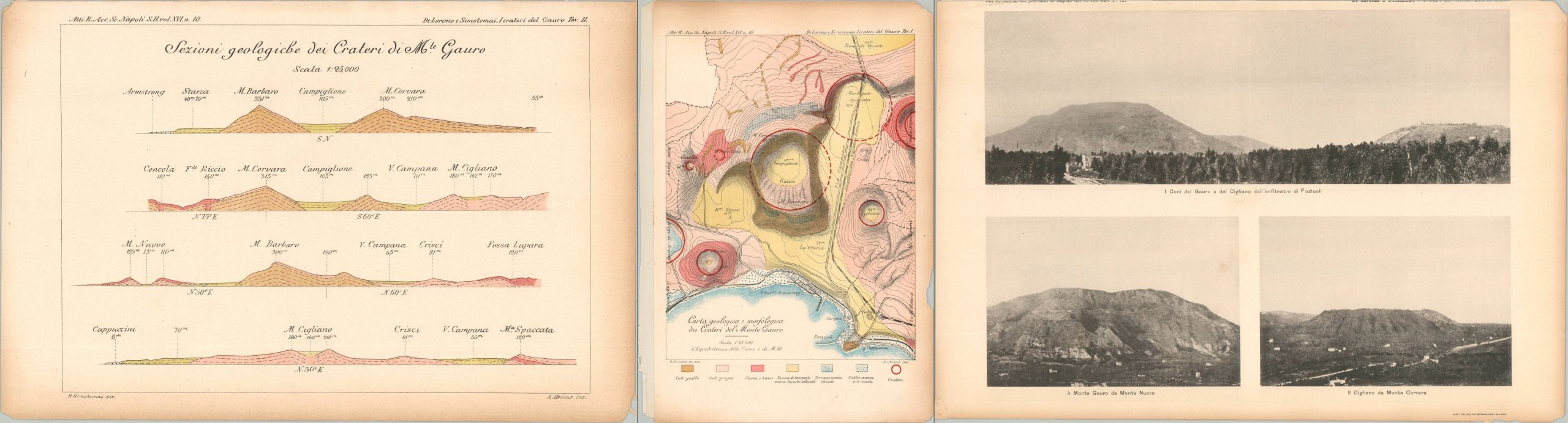 This trio of plates represents early 20th century research performed by G. DeLorenzo and H. Simotomai on the geology of Italy’s Mt. Gauro (also called Mt. Barbaro). The volcanic peak overlooks the Gulf of Naples, west of the city, and its distinctive crater was caused by an ancient eruption of unknown date. A cross section, topographic map, and photographic views offer a detailed visual overview of the landmark and its geography.