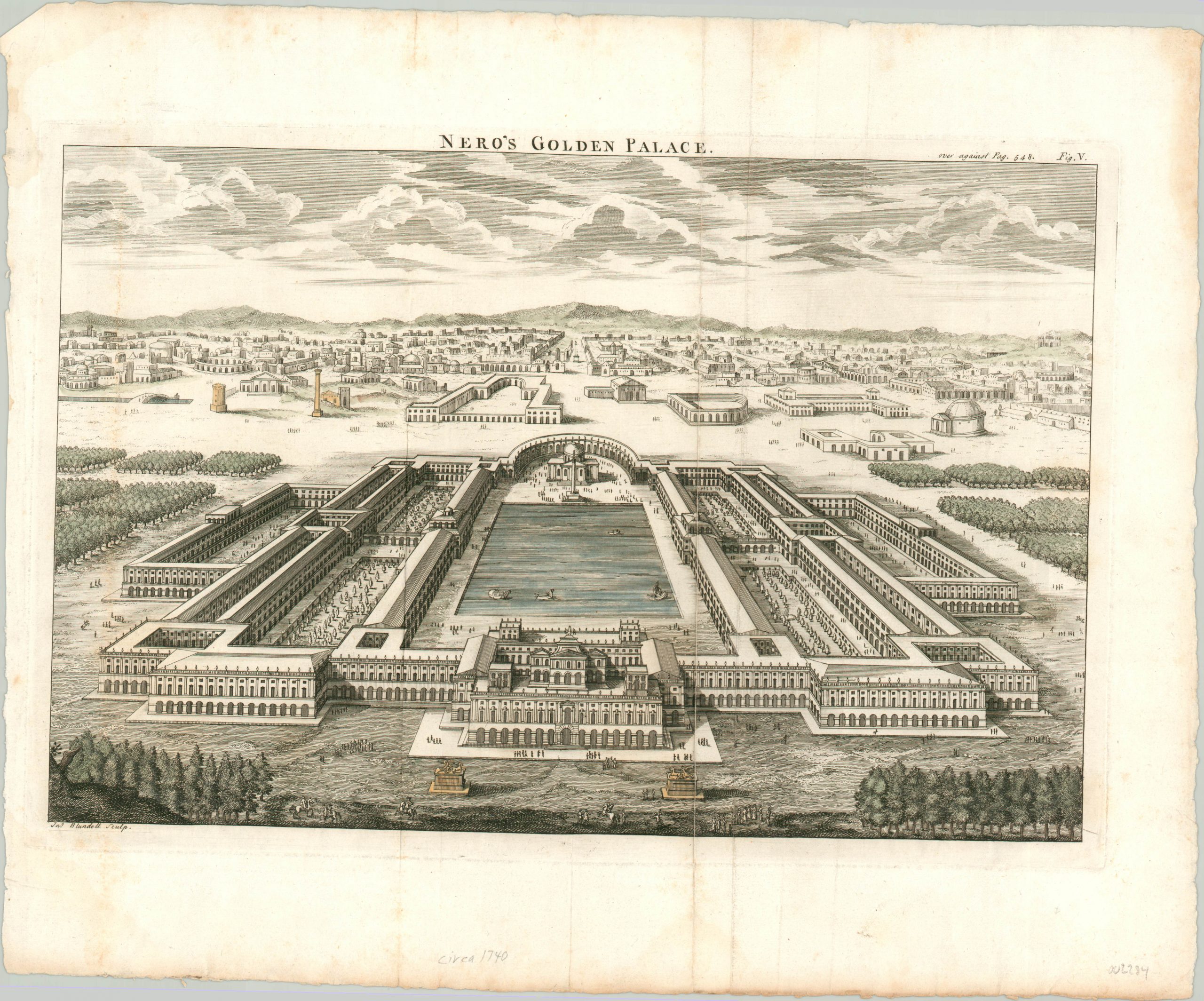 This attractive print shows the immense grounds of Nero’s Domus Aurea, or Golden Palace. Built upon the ruins of the fire that destroyed much of Rome in 64 AD (allegedly while the emperor fiddled), the vast complex took less than five years to construct.