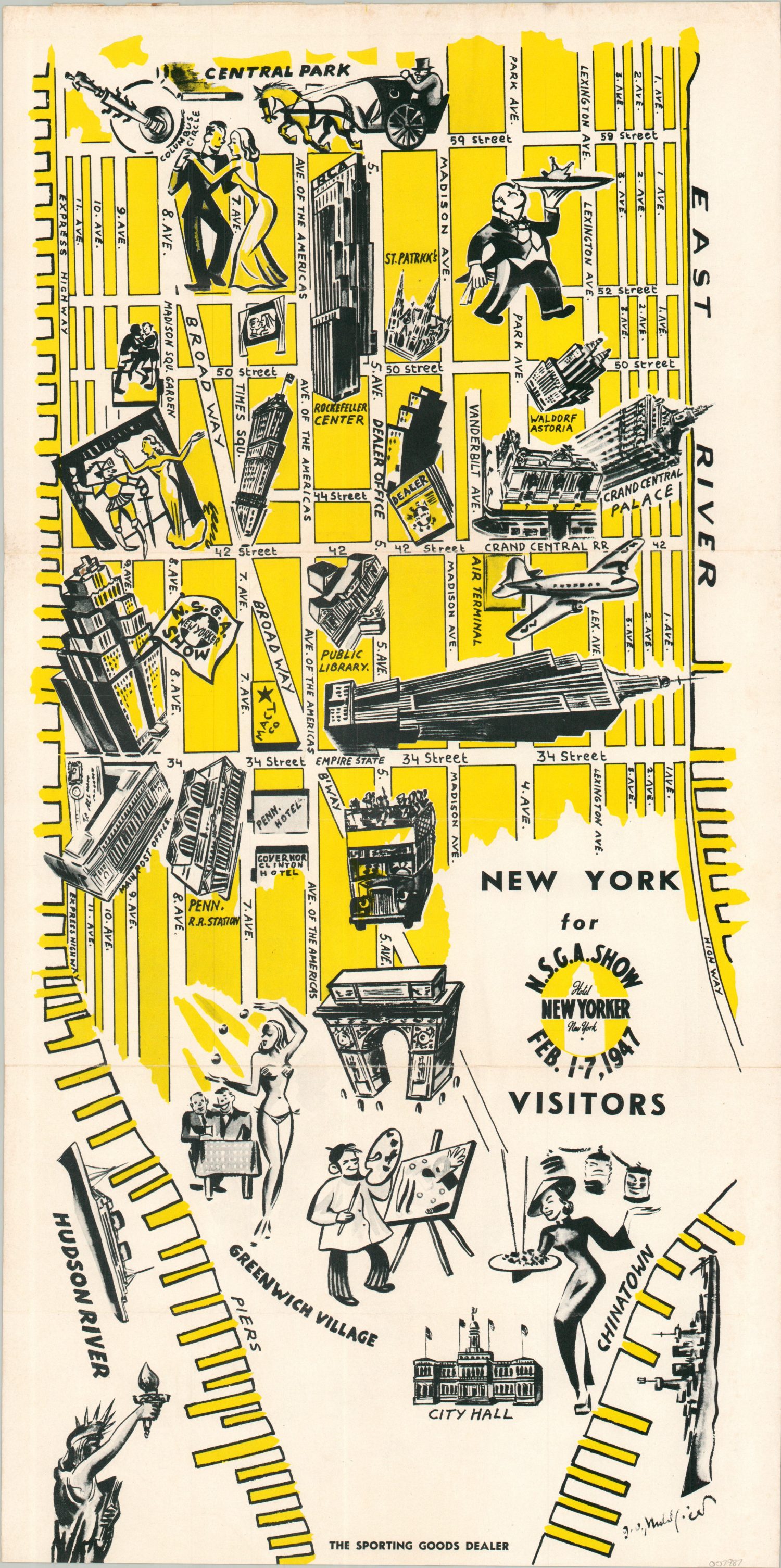 This punchy post war map of Midtown Manhattan heavily distorts the geography of the Big Apple to best highlight attractions surrounding the Hotel New Yorker. The historic luxury accommodations were host to the Annual Convention of the National Sporting Goods Association in February 1947, and the pictorial fold-out was issued to accompany the official program. Nearby locations of interest include the Empire State Building, Times Square, the Rockefeller Center, and Central Park. Greenwich Village, Chinatown, and City Hall are also shown in an abstract fashion.