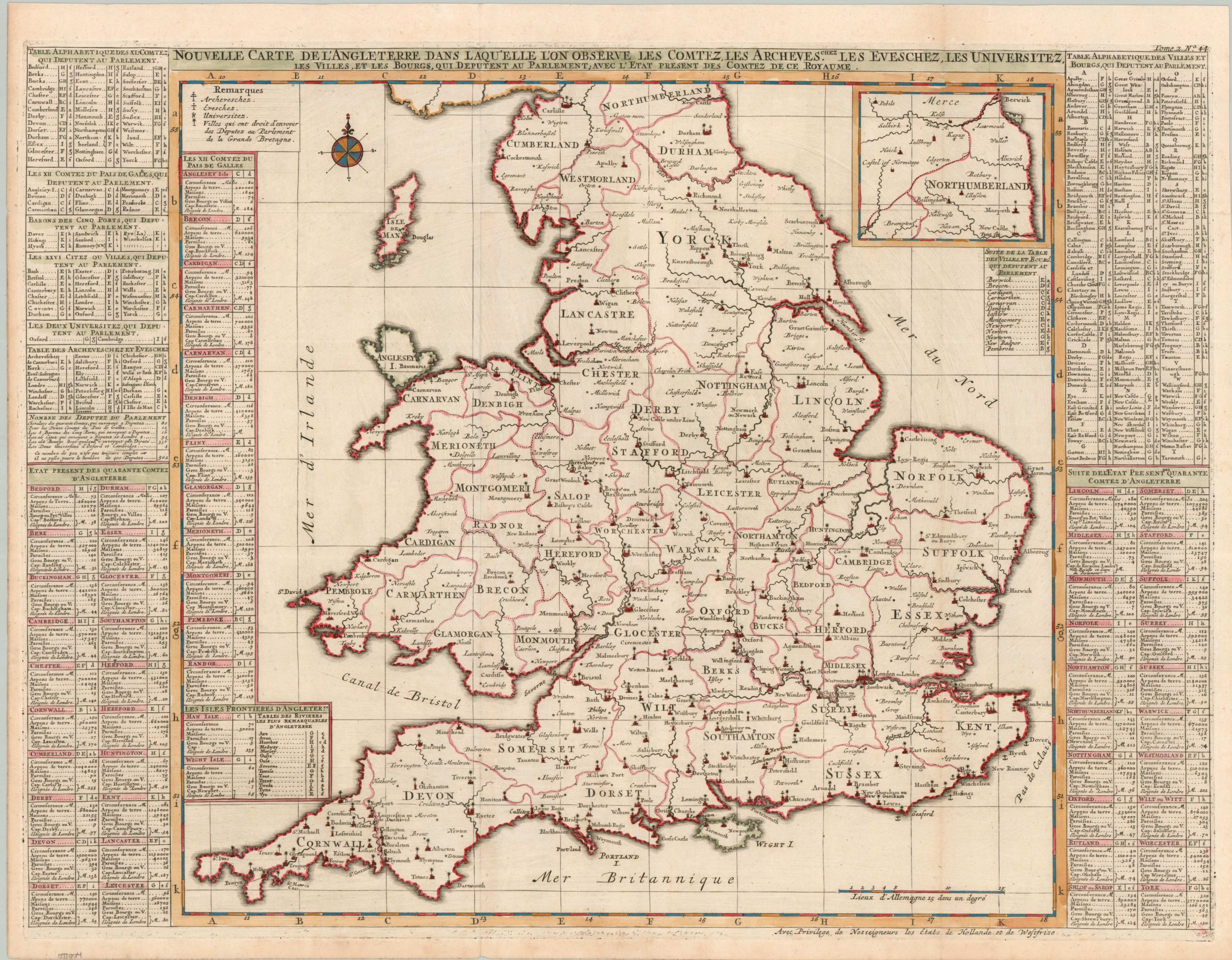 This lovely hand colored map outlines the urban composition of England and Wales. Ecclesiastical and political units like parishes and counties are outlined and labeled throughout the image. Diosces, universities, and towns represented by Parliament are identified according to the legend in the upper left. Lists on either side of the page offer further details. The copperplate-engraved sheet was originally published in Paris as part of Henri Abraham Chatelain’s important Atlas Historique.
