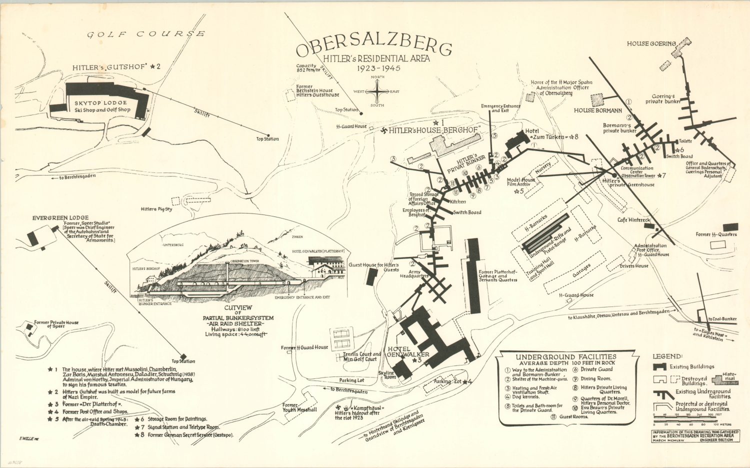 This plan, published decades after the war ended, provides a detailed snapshot of the area as it existed under the Nazi regime. Buildings are outlined and individually labeled, identifying private residences, recreational facilities, military structures, and historic sites. A cut-away diagram shows the underground facilities, which are also outlined by the legend in the lower right. Numerous buildings are shown as destroyed – the Bavarian government demolished many of the structures intentionally during the 1950s. Today, only the Kleinhaus (Eagle’s Nest) remains, but is not shown on the map (see lower right).