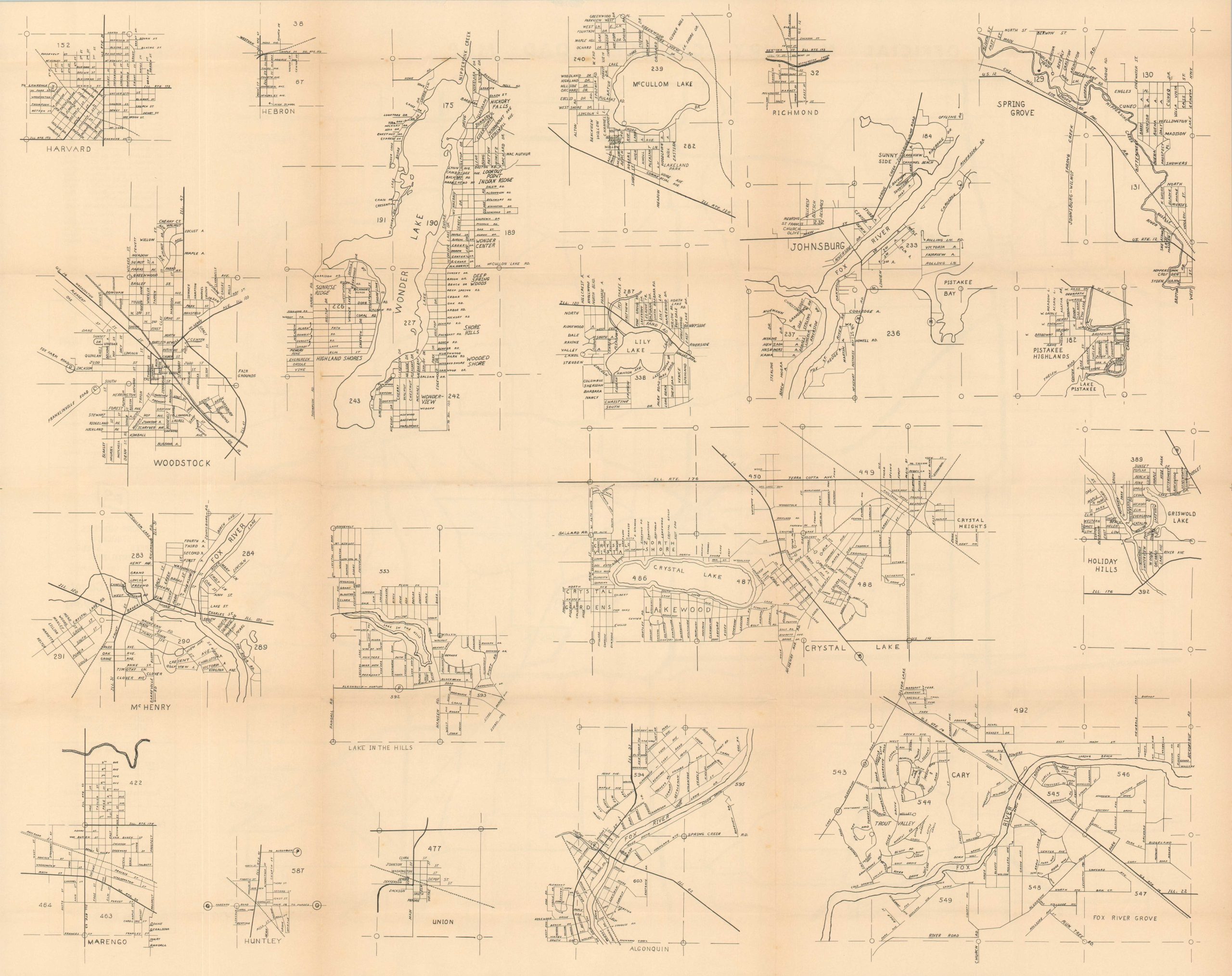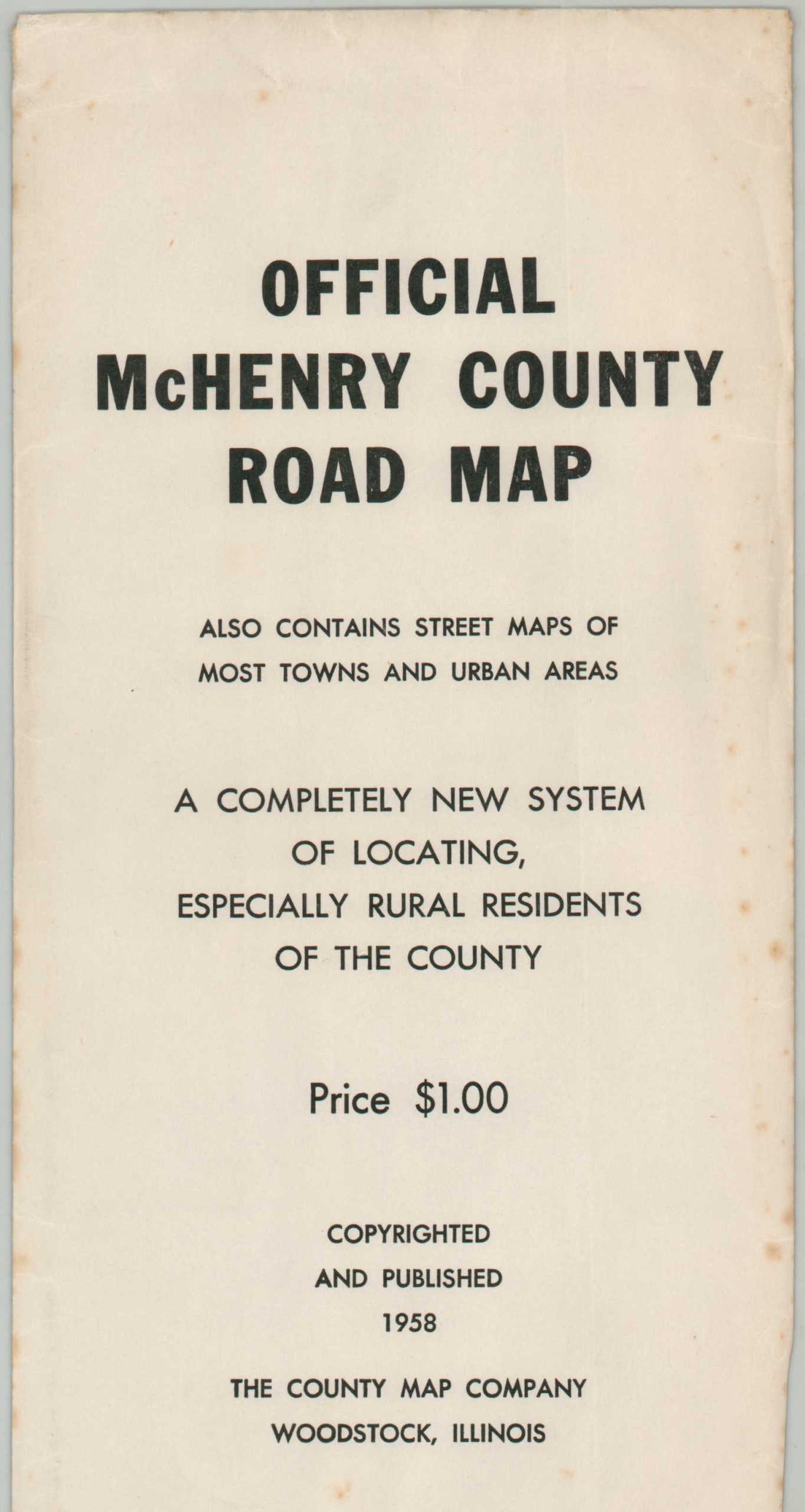 This detailed road map of McHenry County, Illinois was copyrighted and published in 1958 by The County Map Company of Woodstock. An interesting disclaimer is noted in the upper right. Thick black lines show ‘all-weather roads’ while ‘other roads’ (presumably dirt) are outlined. Block numbers are provided in red, each within one-mile square increments designed to offer an innovative for locating residences. The verso presents large-scale street plans of most of the towns within the county, including Woodstock (county seat), Crystal Lake, Marengo, Harvard, and McHenry.