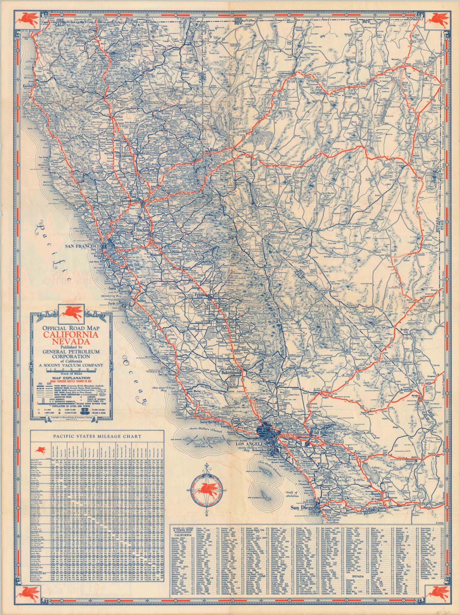 With a clear economic incentive to get motorists on the roads, oil companies were major producers of road maps from the earliest days of the automobile. This example covering three western states – California, Nevada, and Arizona – was issued by General Petroleum, a division of Socony Vacuum and producer of Mobilegas. (The distinctive Pegasus icon can be seen in each corner and within the compass rose).