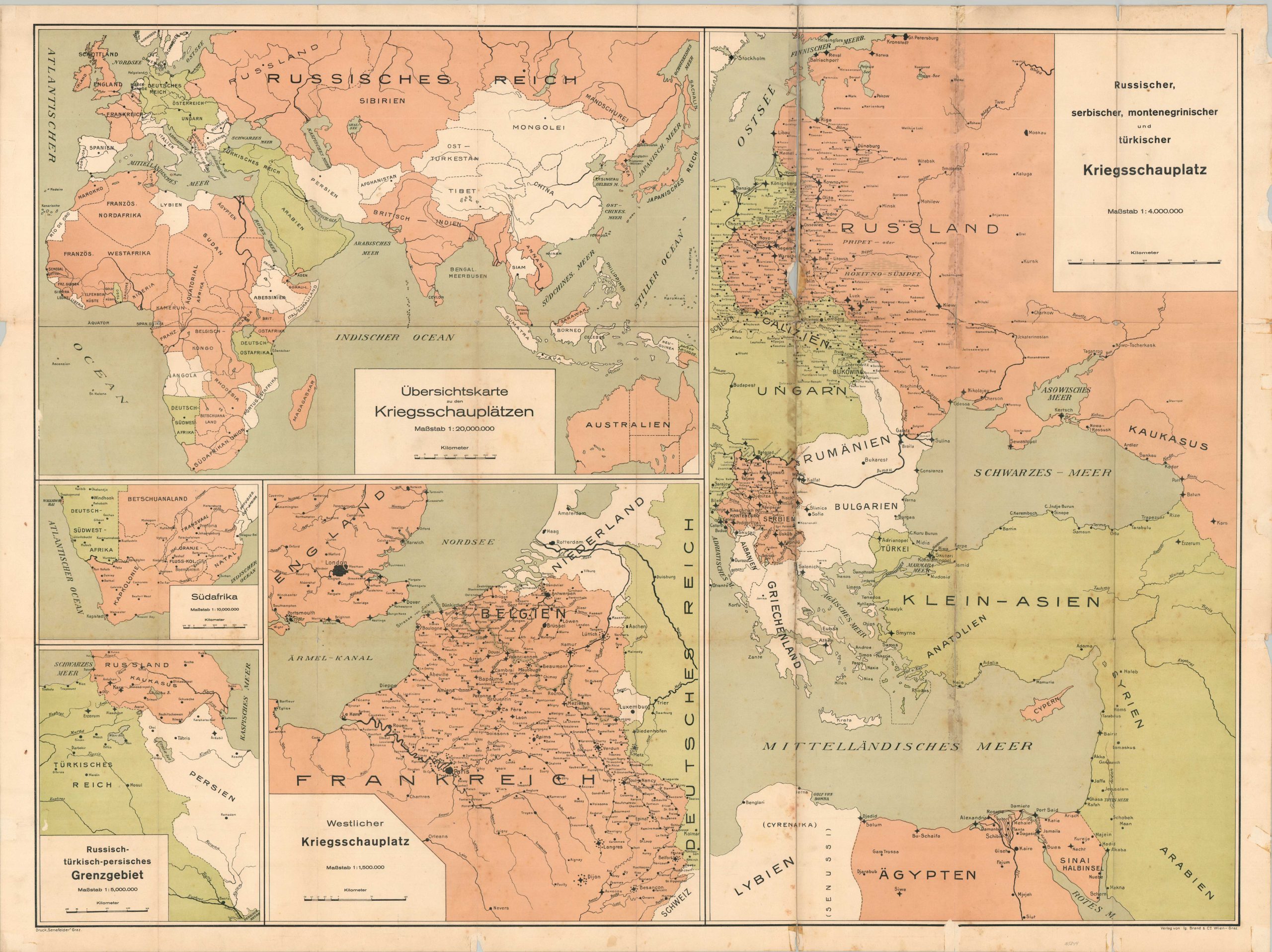 This impressive compilation of five different maps was issued in German, probably in late 1914 or early 1915, based on the depiction of the fronts and the high number of apparently neutral countries (white). Territory under control of the Central Powers (Germany, Austria-Hungary, and the Ottoman Empire) are highlighted in green, while those of the Triple Entente (France, the United Kingdom, and Russia) are shown in pink.