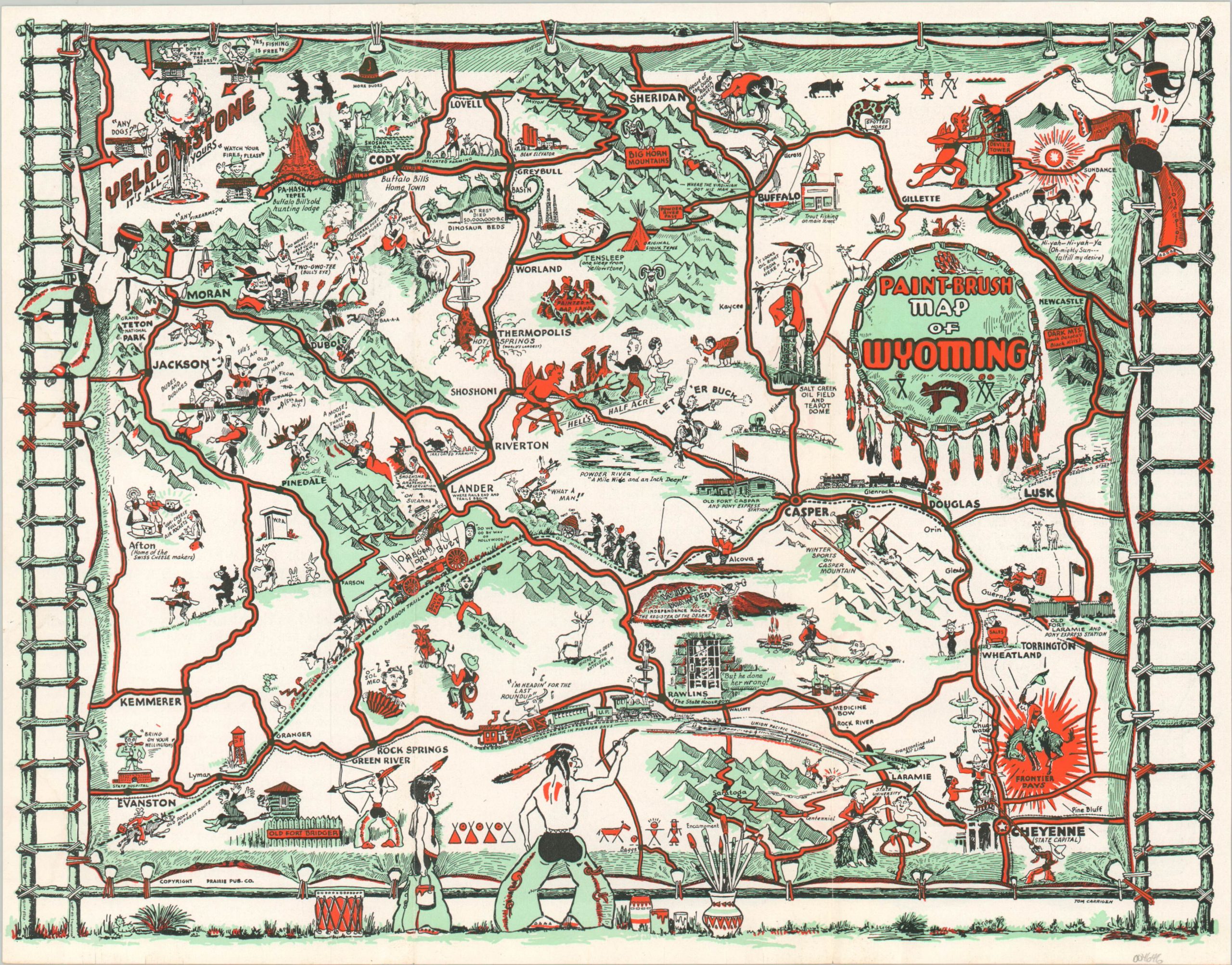 This colorful cartoon map of Wyoming was illustrated by Tom Carrigen and published in Casper by the Prairie Publishing Company in 1949, according to statistics on the verso. Humorous tongue-in-cheek vignettes highlight many regional attractions, historic sites, and cultural icons. Examples include Devil’s Tower, the Shoshoni Dam, and inspiration from polygamy along the Mormon Trail.
