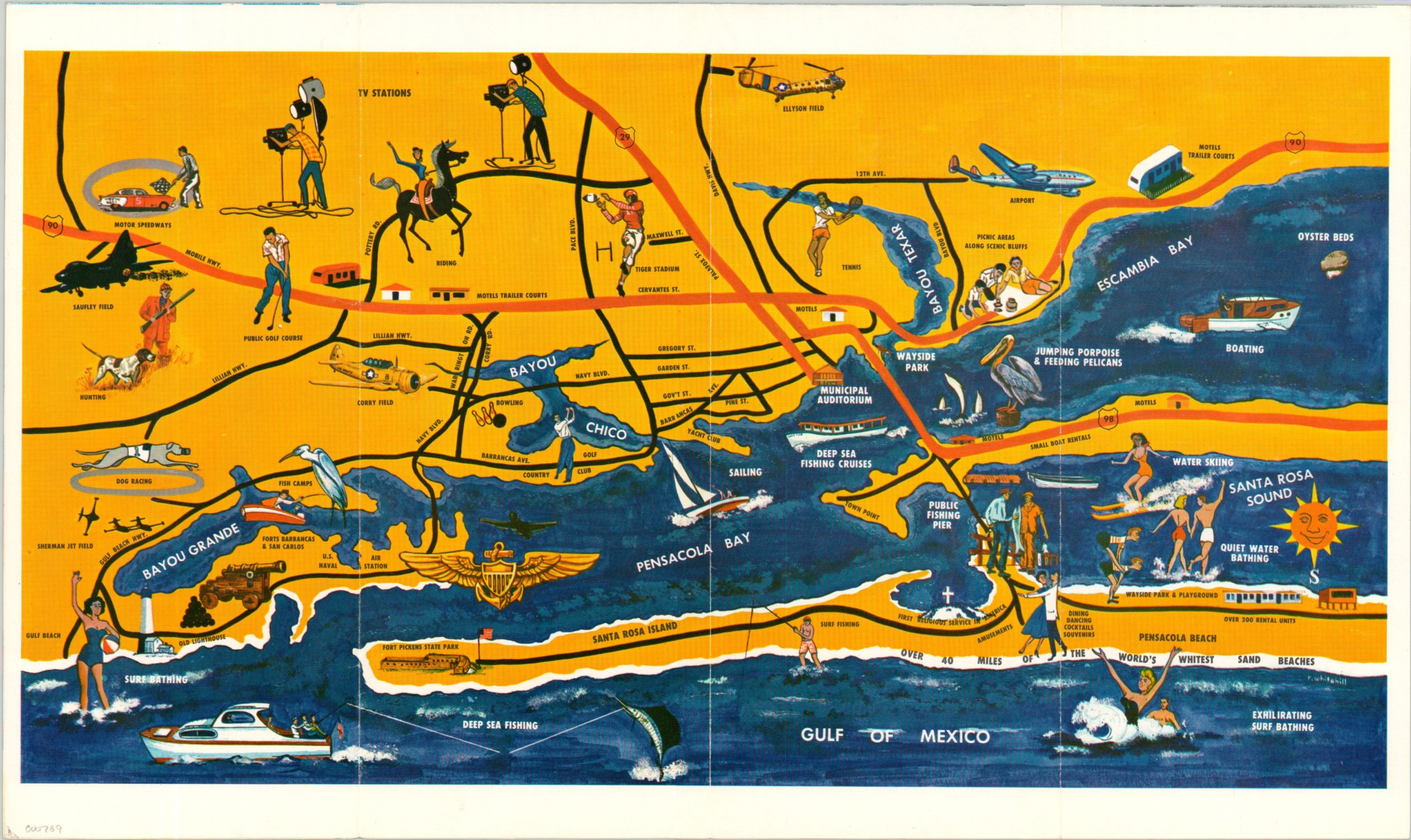This simple, but colorful, map shows the high points of Pensacola and the surrounding area. Bright vignettes highlight the available recreational activities, historical heritage, and significant military presence in the midst of the Cold War.