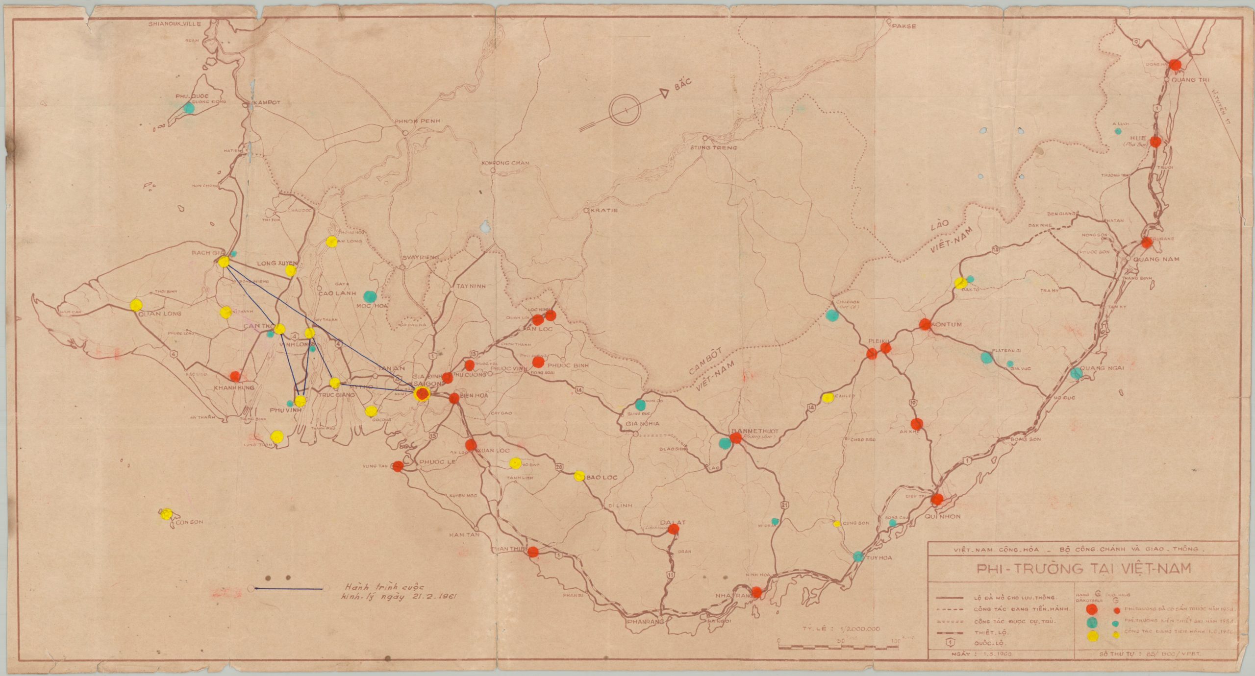 This rare map of Vietnam (oriented with northwest at the top) was produced by the Ministry of Public Service and Transport for the Republic of Vietnam in early 1961, as American involvement in the regional conflict began to escalate. The image outlines the nation’s transportation infrastructure, with a particular emphasis on operational airfields during three separate phases – those built prior to 1954 (red), after 1954 (green), and under construction (yellow). Runways are shown in major hubs like Saigon, Da Lat, and Da Nang, as well as remote outposts in the Central Highlands and the Mekong Delta. A blue route line, written by hand, notes the path of an official inspection tour that took place in February 1961.