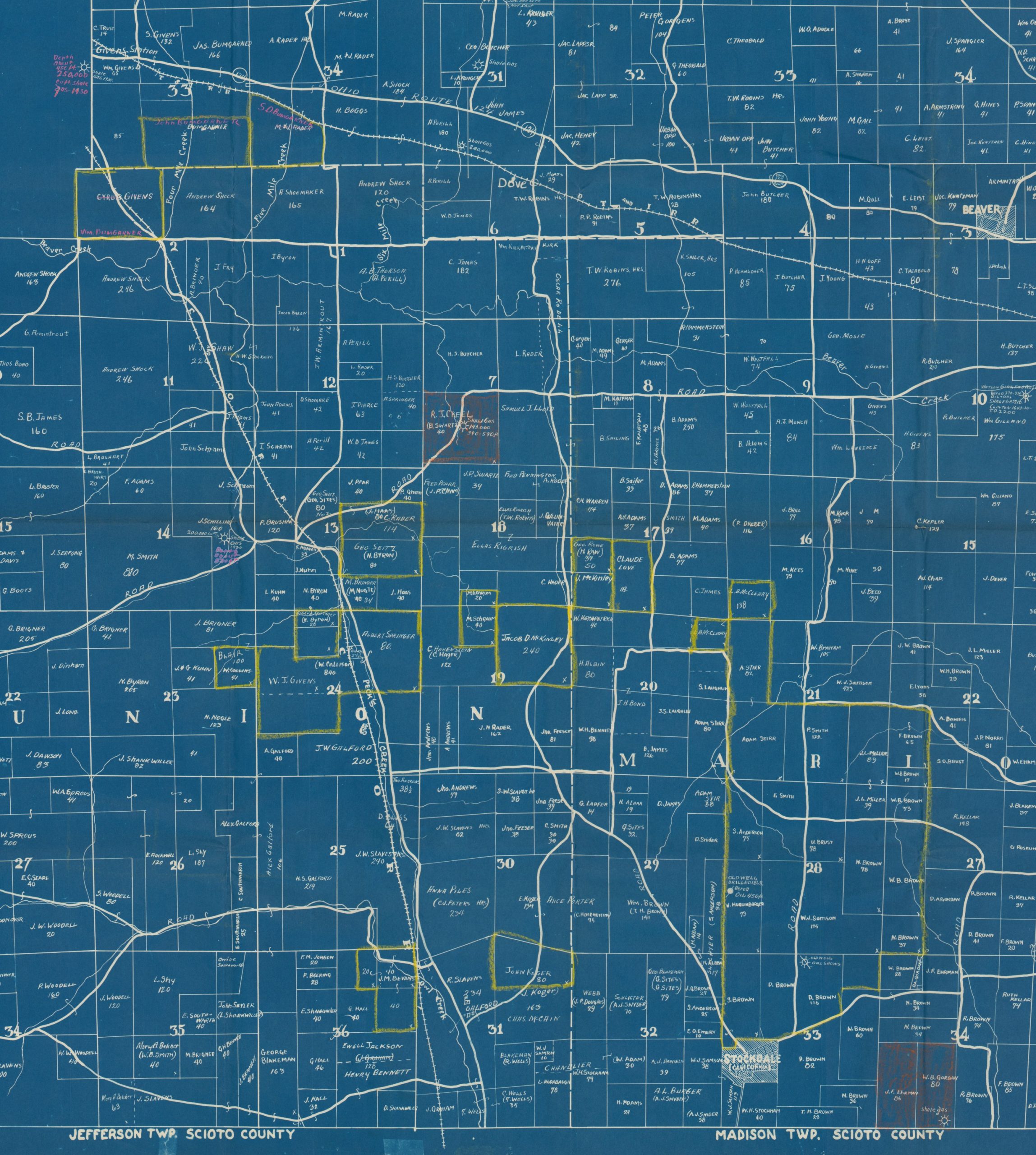 This huge plat map covers Pike County in southern Ohio. Though topography is absent, it’s important to note that the county is part of Appalachia and thus rugged and mountainous. Like many other locales in that scenic region, Pike County was home to a number of oil deposits.