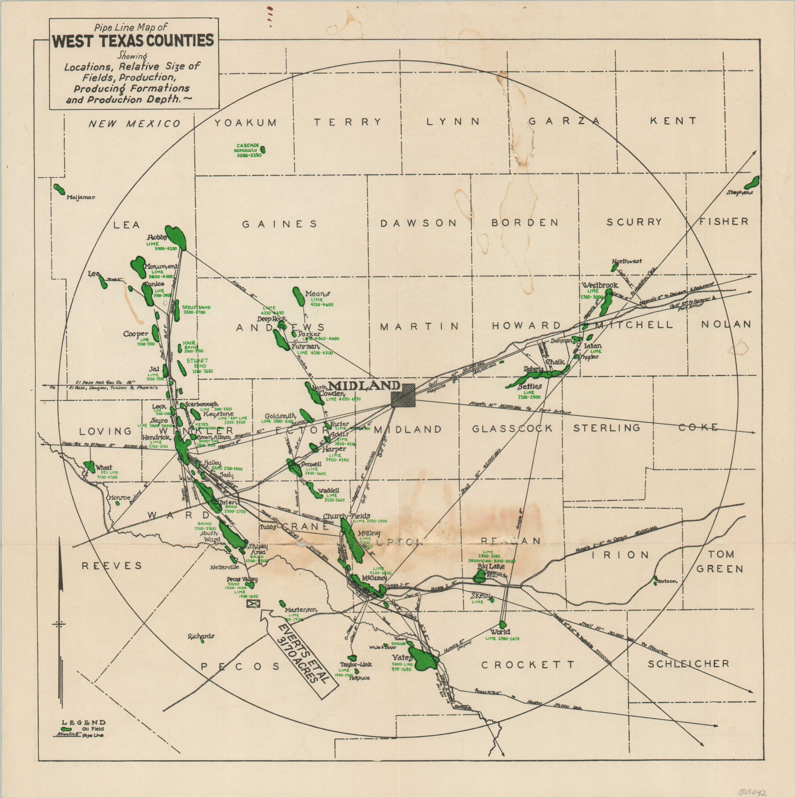 A box south of the Pecos Valley Field identifies 3,170 acres for sale by Everts et. al., helping to identify the otherwise anonymous map as a promotional item for a group of land speculators or realtors. Difficult to date, but likely published in the late 1930s based on the presence of the Skelly Sands Field, first tapped in 1935, and an online reference to C.A. Everts et. al. from 1938.