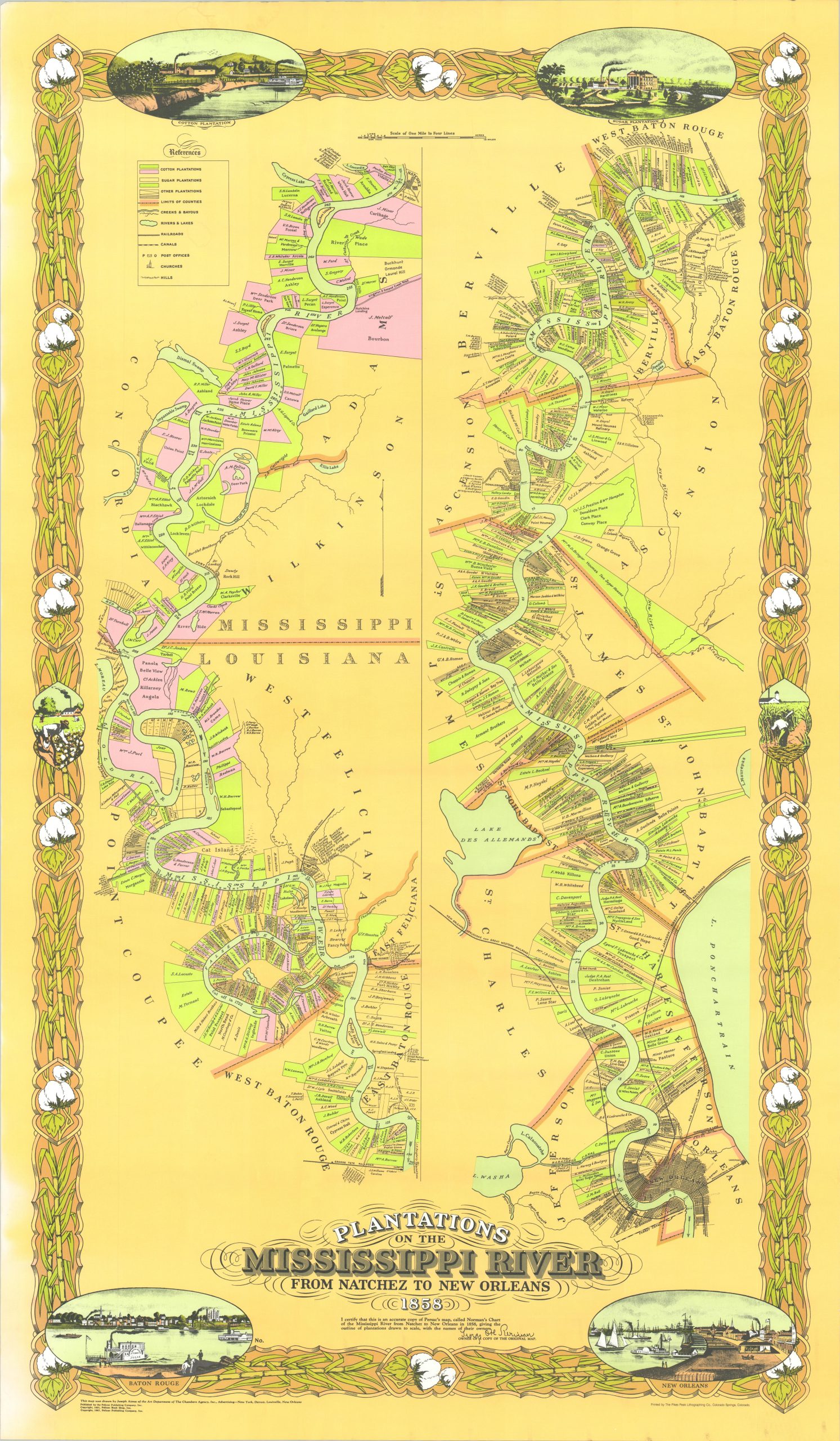 “This 1858 hand-colored map gives a detailed rendering of all the plantations along the lower Mississippi River from Natchez, Mississippi, to New Orleans, Louisiana. As indicated by the color-coding shown at upper left, the plantations between New Orleans and Baton Rouge primarily cultivated sugarcane, while those between Baton Rouge and Natchez cultivated cotton.