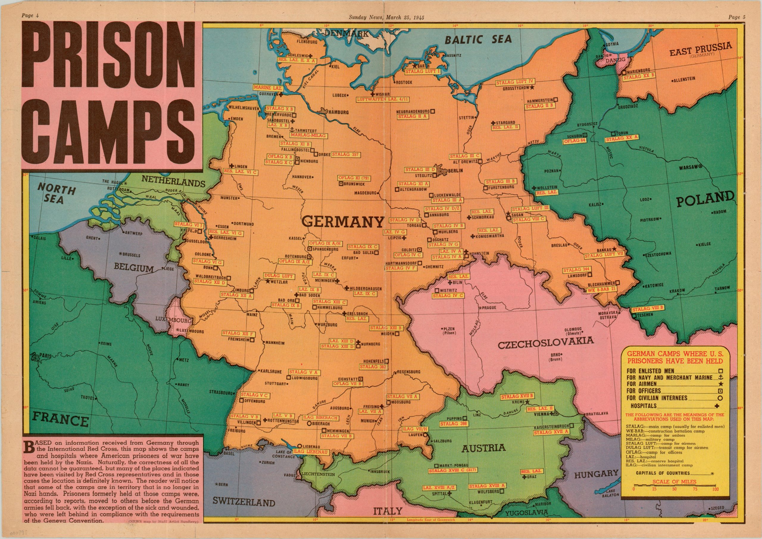 This map was drawn by staff artist Edwin Sundberg for the March 25, 1945 edition of the New York Sunday News. It shows the location of prisoner of war camps throughout Germany and Poland in which American soldiers have been held captive. Various types of camps are indicated using different symbols identified within the legend. Nearly 100 locations are identified, but this represents just a small fraction of the ~1,000 POW camps operated by the German army during the war.