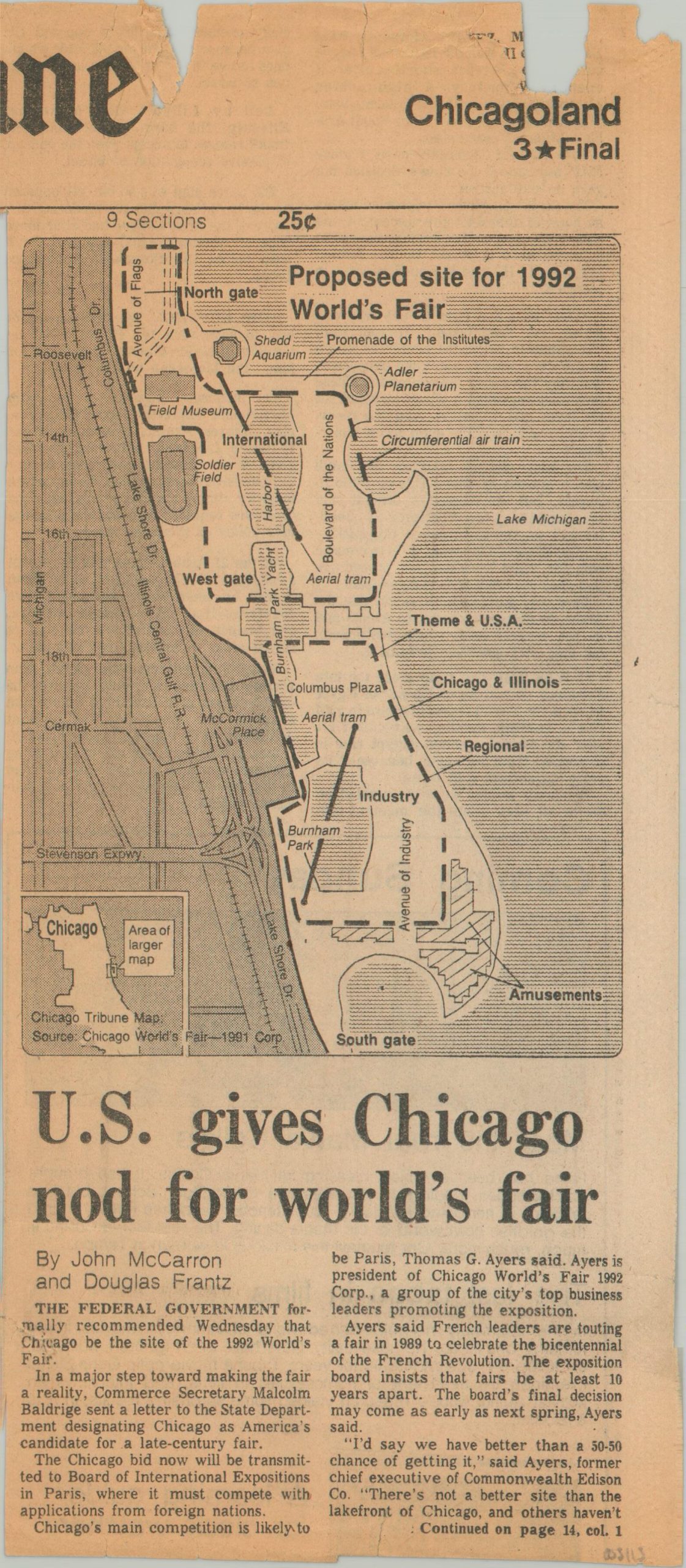 Collection of articles outlining the planning for the 1992 Chicago World’s Fair.
