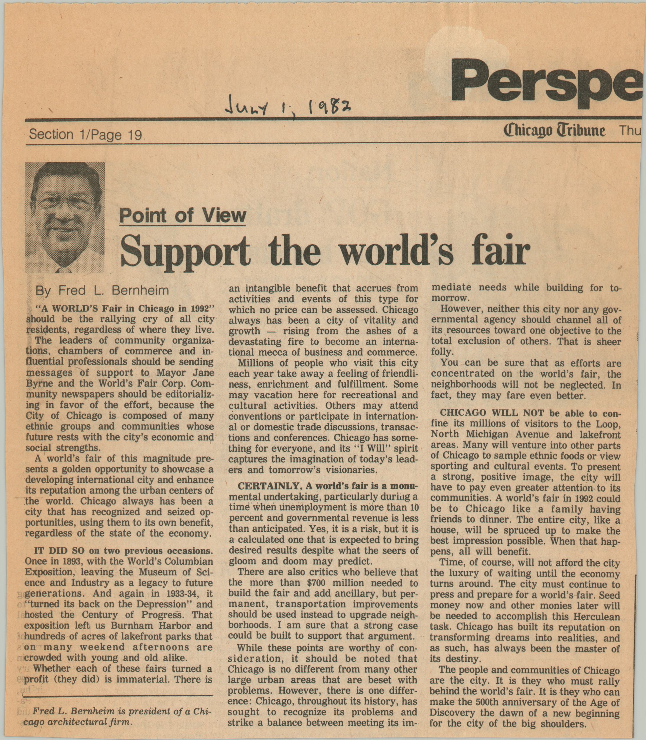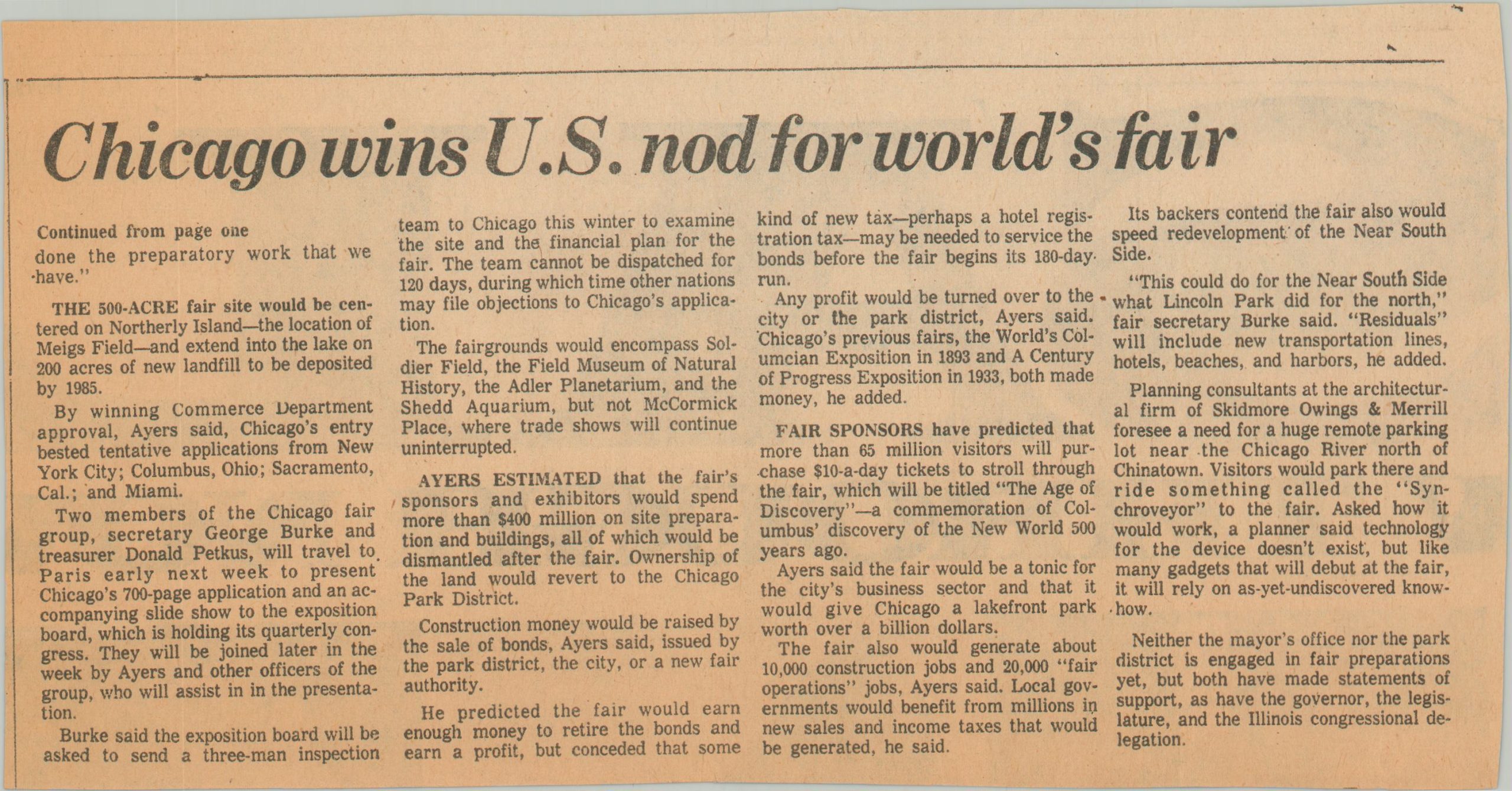 This interesting assortment of articles from the Chicago Tribune provides fascinating details on early planning for a proposed 1992 World’s Fair. Organized to commemorate the 500th anniversary of Columbus’ arrival in the New World, the project had significant backing from private sponsors and Mayor Jan Byrne.