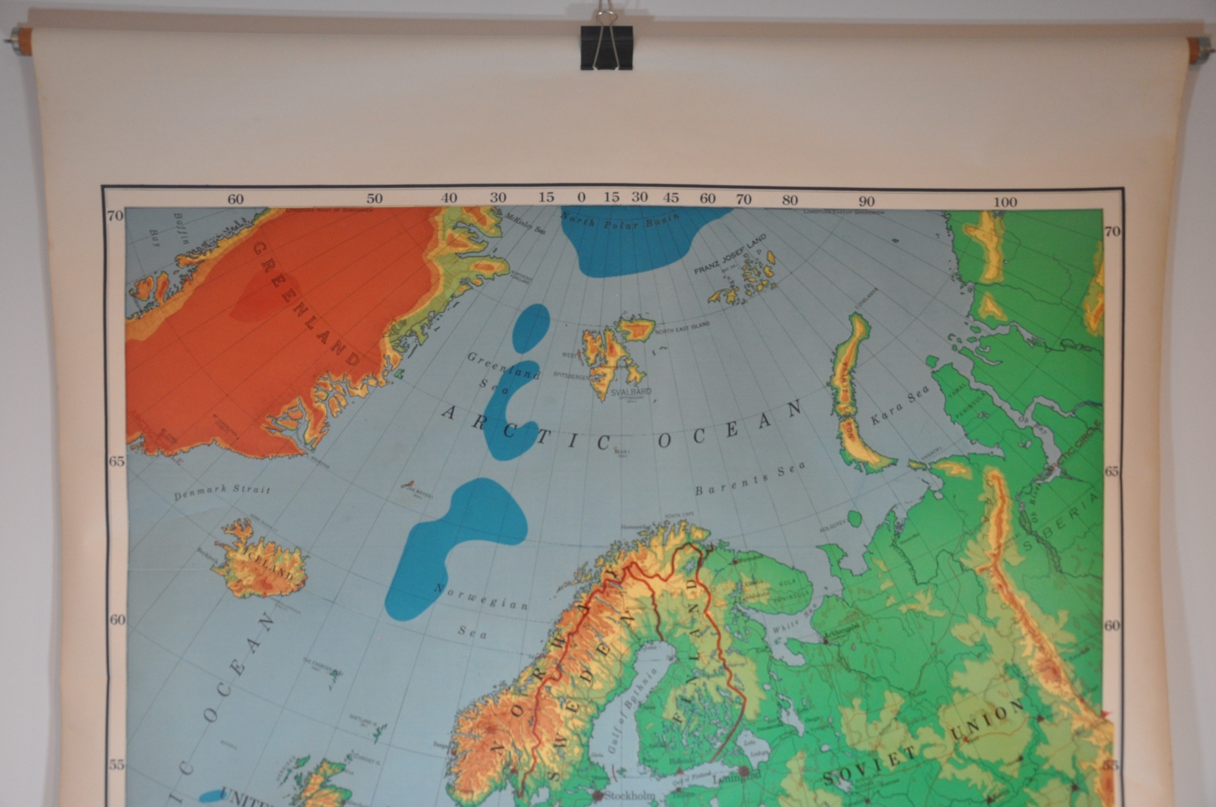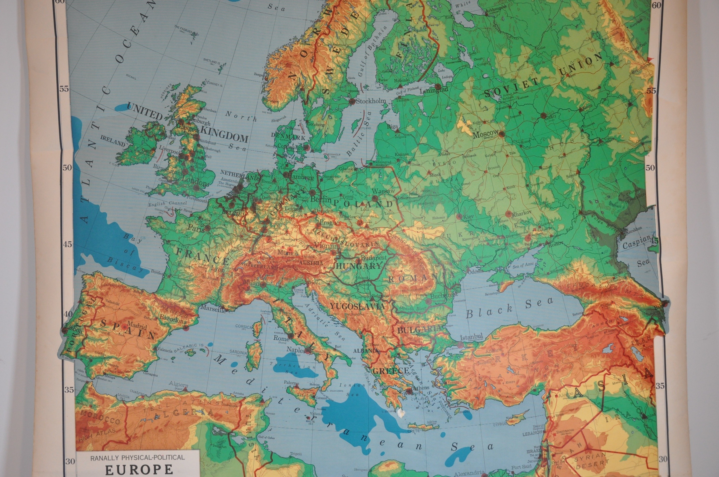 This large physical map of Europe uses vibrant shades of color to distinguish various levels of height across the continent. From dark blue (20,000 ft below the sea and deeper) to dark red (10,000 feet and up), the diverse geographic composition of the Earth is on display from North Africa to the Arctic Ocean and from the Bay of Biscay to the Caspian Sea.