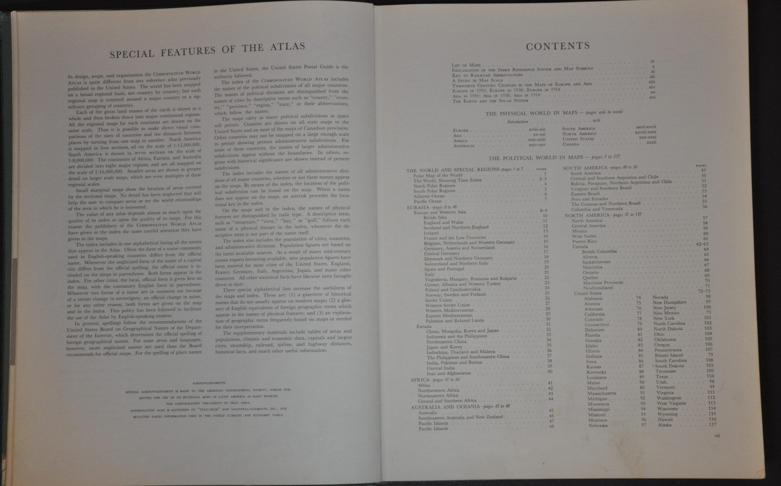 “In design, scope, and organization the Cosmopolitan World Atlas is quite different from any reference atlas previously published in the United States. The world has been mapped on a broad regional basis, not country by country; but each regional map is centered around a major country or a significant grouping of countries.” – Special Features Section.