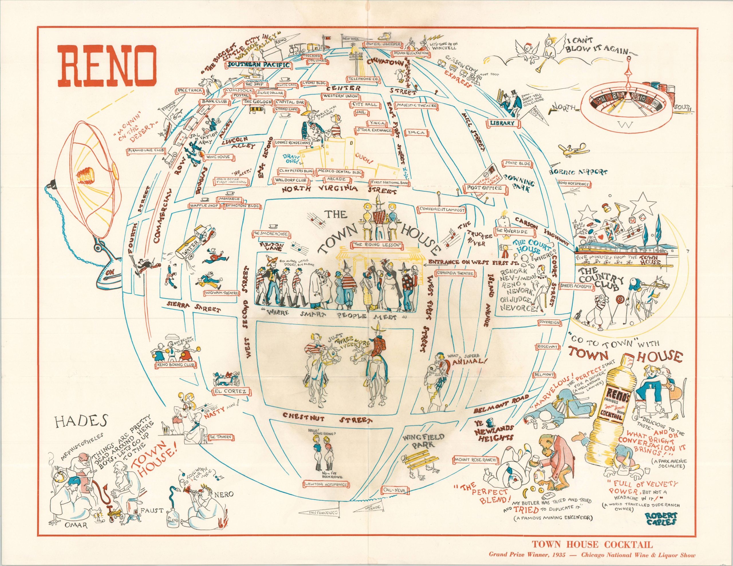 This c. 1936 map was published to promote Reno’s Town House, a popular saloon and restaurant with a small casino. The building is faintly outlined in yellow in the center of the image, identifiable by the crowd at the door – “Where Smart People Meet.” The available opportunities for newly (or soon to be) single women are reflected in the popular Town House logo/cartoon in the center of the sheet, featuring the double-entendre caption “The Riding Lesson.”
