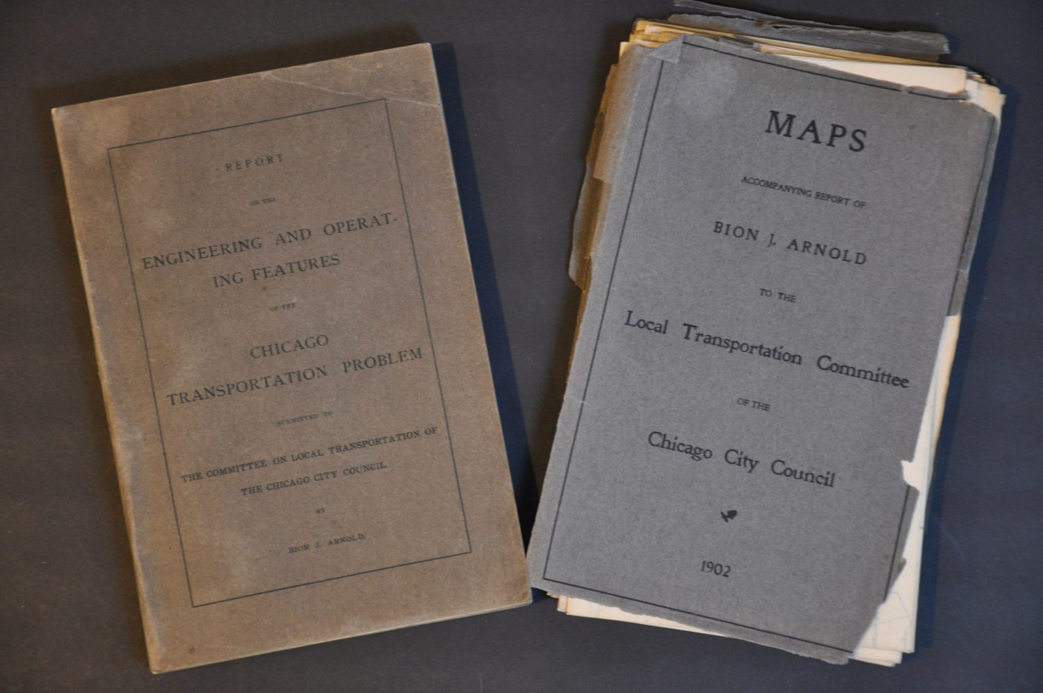 However, significant problems remained with the system of independent operators, and the Chicago City Council enlisted the help of talented transportation engineer Bion J. Arnold to propose potential solutions. This is the result of his work, encapsulated in an exhausting 300+ page report and over two dozen fold-out maps, charts, and construction diagrams. Arnold presents a well-researched, persuasive argument for consolidation among companies, the construction of additional subway lines, and other significant improvements. The contents of the report include financial estimates, population/ridership statistics, recommendations for policy and network changes, practical engineering advice on transit construction, and several appendices.