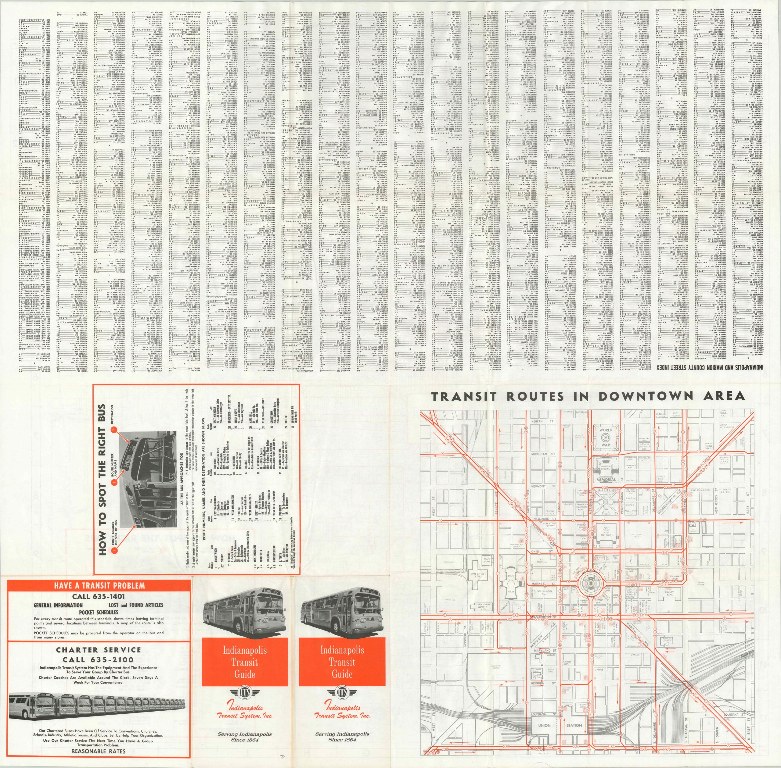 The verso features a large scale inset map of downtown, as well as a comprehensive street index with numbers and letters corresponding to the map’s border. Published by Indianapolis Transit Services, Inc., predecessor to the Indianapolis Public Transportation Corporation (IndyGo).