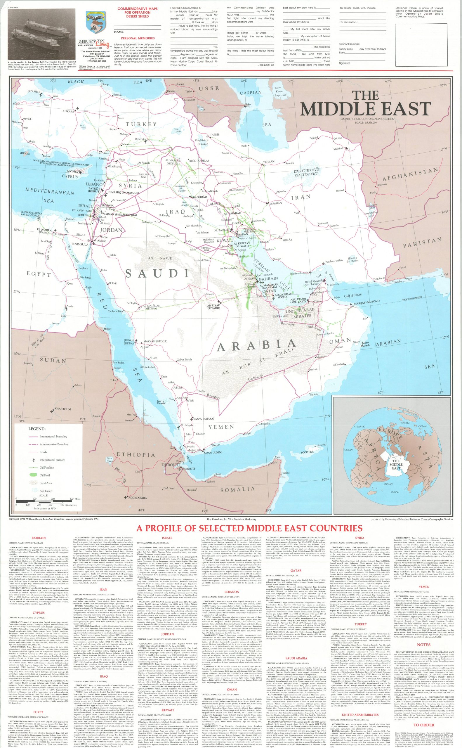 This map of Saudi Arabia was published in 1991 to observe and celebrate Operation Desert Shield, a massive U.S.-led military buildup to deter Iraqi aggression under Saddam Hussein. The transportation and oil infrastructure is emphasized in the primary image, with surrounding captioned photographs providing additional context. A similarly designed map of the whole Middle East can be found on the verso, accompanied by descriptive text of selected Middle Eastern countries.