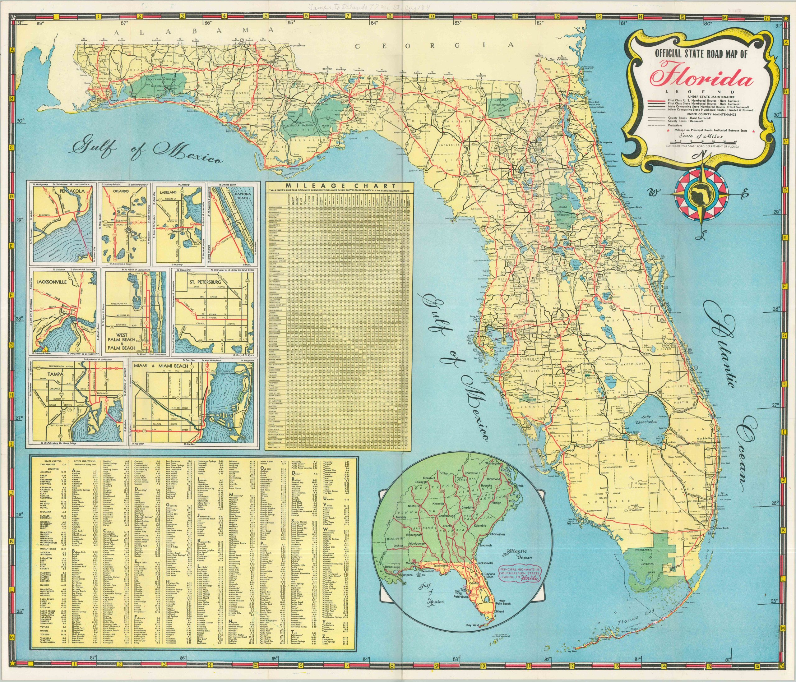 This vibrant pictorial map of Florida was originally designed by George D. Way in the early 1940s, though this is a later postwar issue. The inviting image highlights the robust network of highways, various outdoor attractions, and abundant flora and fauna of the Sunshine State. Captioned photographs in the surrounding area depict several prominent landmarks and leisures. The verso of the sheet offers a more practical road map of the entire state, with inset plans of major urban areas.