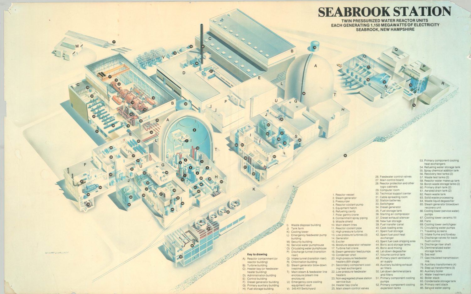 This rare diagram presents an illustrated cutaway and bird’s eye view of Seabrook Station, a proposed nuclear power plant in New Hampshire. Twenty-two separate buildings and eighty-four individual components are identified within, showing the highly complex operations of the plant.