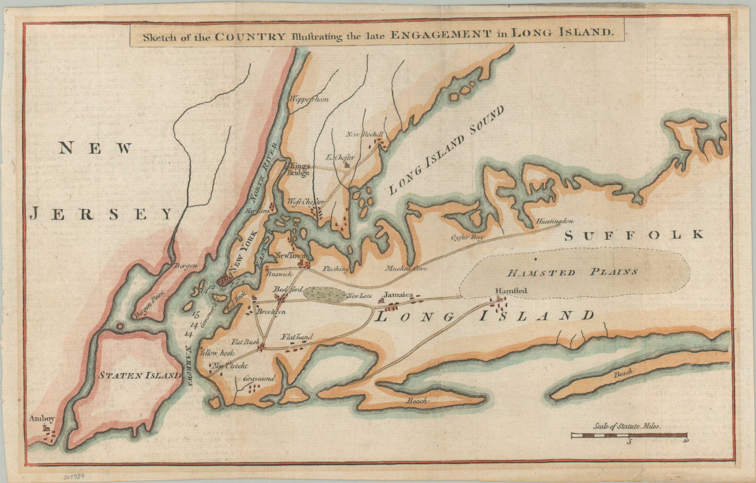 The image notes the major settlements, geographic features, and primary transportation routes across the theater of conflict. An eager British audience could track the movements of Howe and his 30,000+ troops as they crossed from Staten Island to Long Island, crushed Washington’s army near Brooklyn, and followed its retreat to Manhattan.