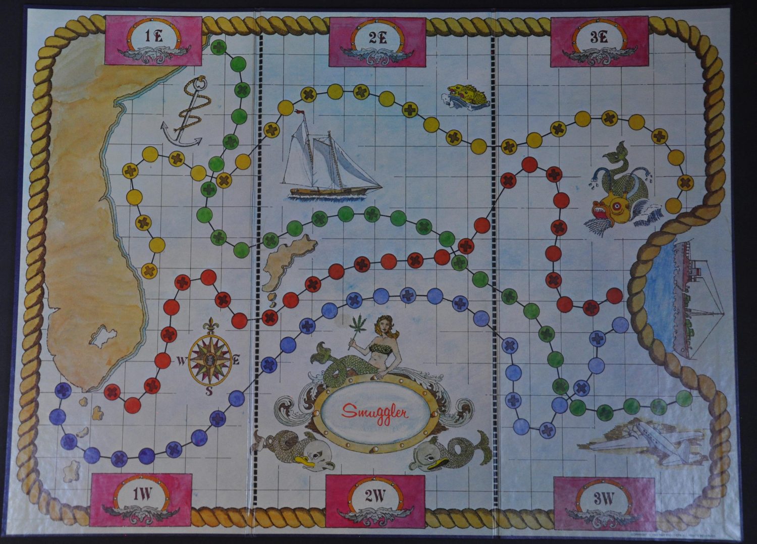 Condition Description: Appears complete, including the tri-fold game board (size given), box, printed instructions, four colored boats, die, 8 pieces of contraband, and 78 playing cards. Light wear, consistent with age, but overall in good condition.