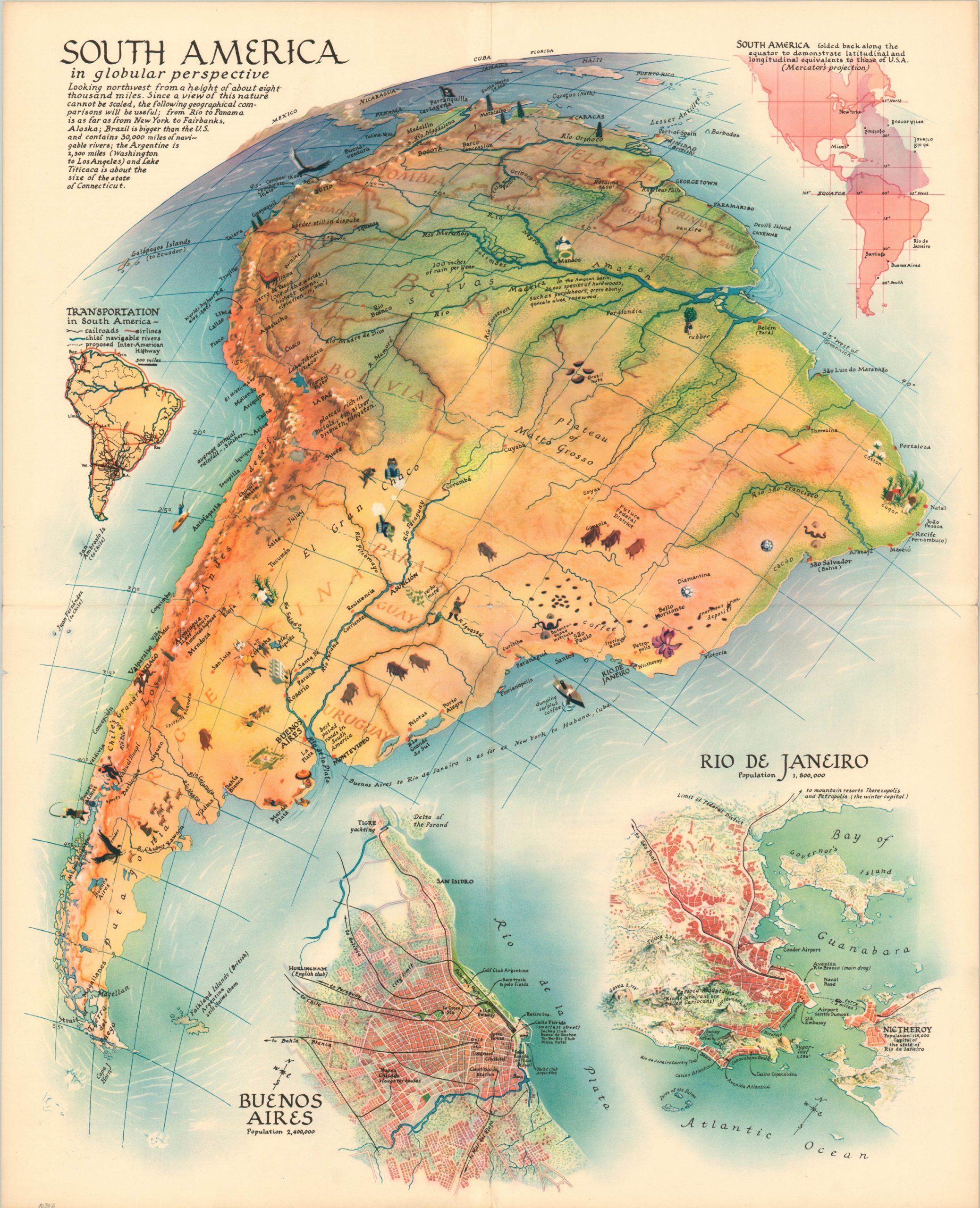 Accompanying text provides further details regarding the “globular perspective looking northwest from a height of about eight thousand miles. Since a view of this nature cannot be scaled, the following geographical comparisons will be useful; from Rio to Panama is as far from New York to Fairbanks, Alaska; Brazil is bigger than the U.S. and contains 30,000 miles of navigable rivers; the Argentine is 2,300 miles (Washington to Los Angeles) and Lake Titicaca is about the size of the state of Connecticut.”