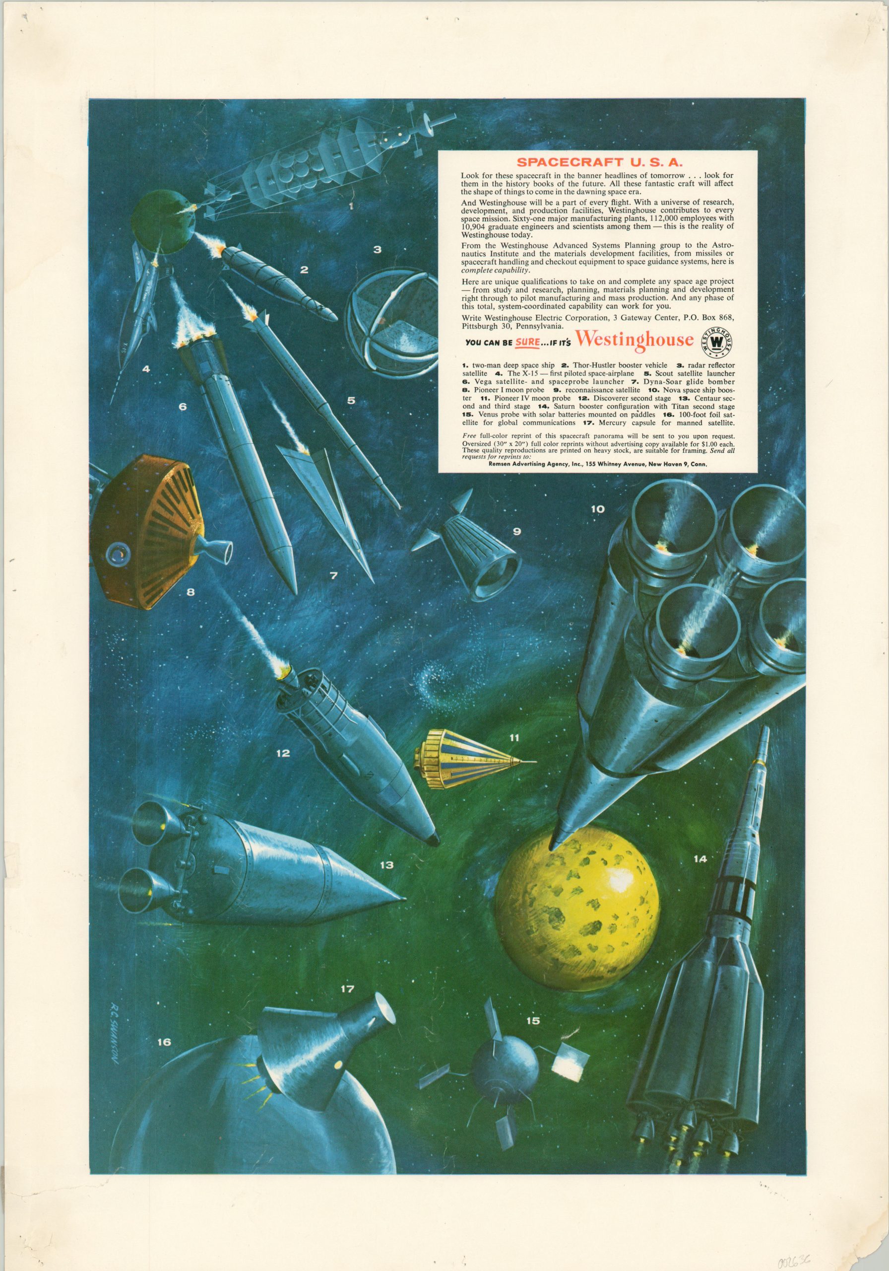 In late 1959, the Westinghouse Electric Corporation opened its Astronuclear Laboratory to assist in the development of nuclear propulsion at the height of the Space Race. This poster was likely issued shortly thereafter, based on the variety of spacecraft depicted within the image.