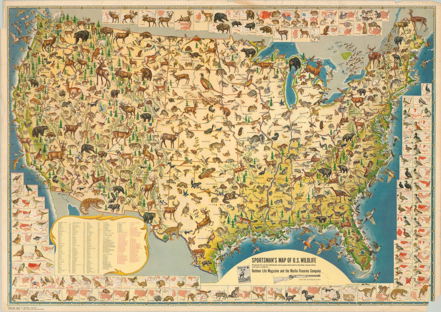 The map was originally drawn by Ira Moss in the early 1950’s and has been issued in a variety of formats in subsequent years. This particular example was published in 1956 to promote the Outdoor Life Magazine and Marlin Firearms Company.