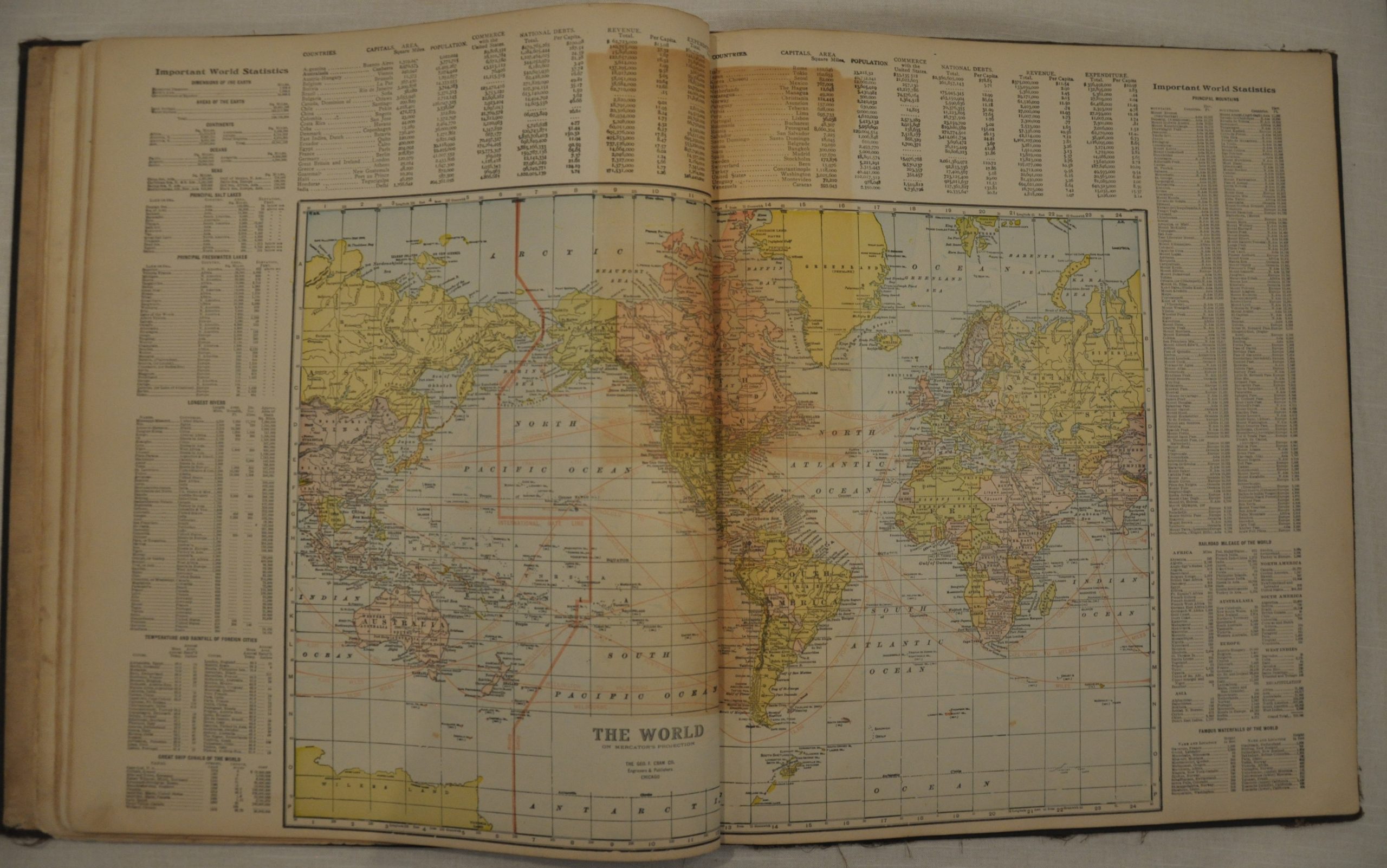 Condition Description: The atlas is complete - 55 pages with 14 single page and 5 double page maps. A few maps are loose, as are the original boards. Overall, the sheets are in good shape, with normal wear and tear along the outer edges. Several maps exhibit moderate soiling and spotting, confined largely to the margins. Significant browning in the center of the world map, but otherwise the maps are clean and in good shape.