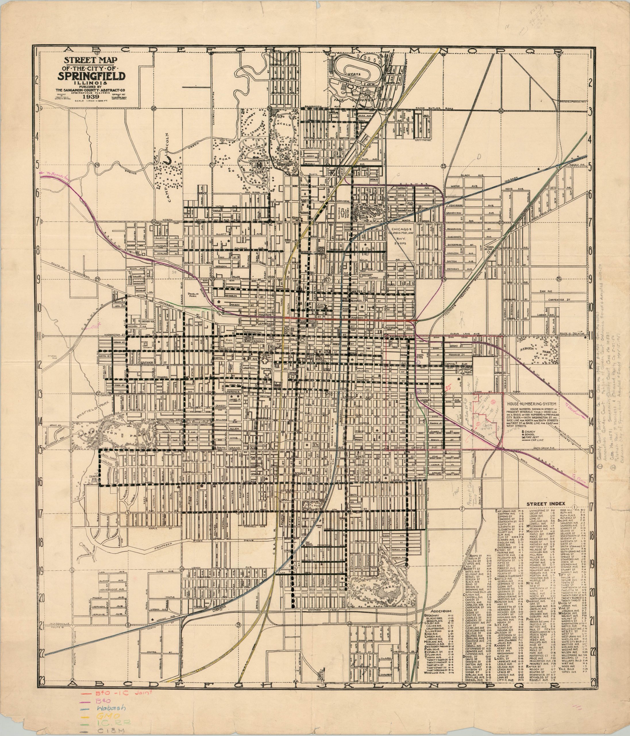 This charming street map of Springfield, Illinois was drafted by Frank L. Melin and Alfred S. Harkness and published locally by The Sangamon County Abstract Co. in 1939. Churches, schools, fire departments, and streetcar lines are noted according to the legend in the center-right. Various other labeled locations of interest include police stations, the state fairgrounds, hospitals, and public buildings. Trees and lakes dot the system of parks scattered throughout the state capital.