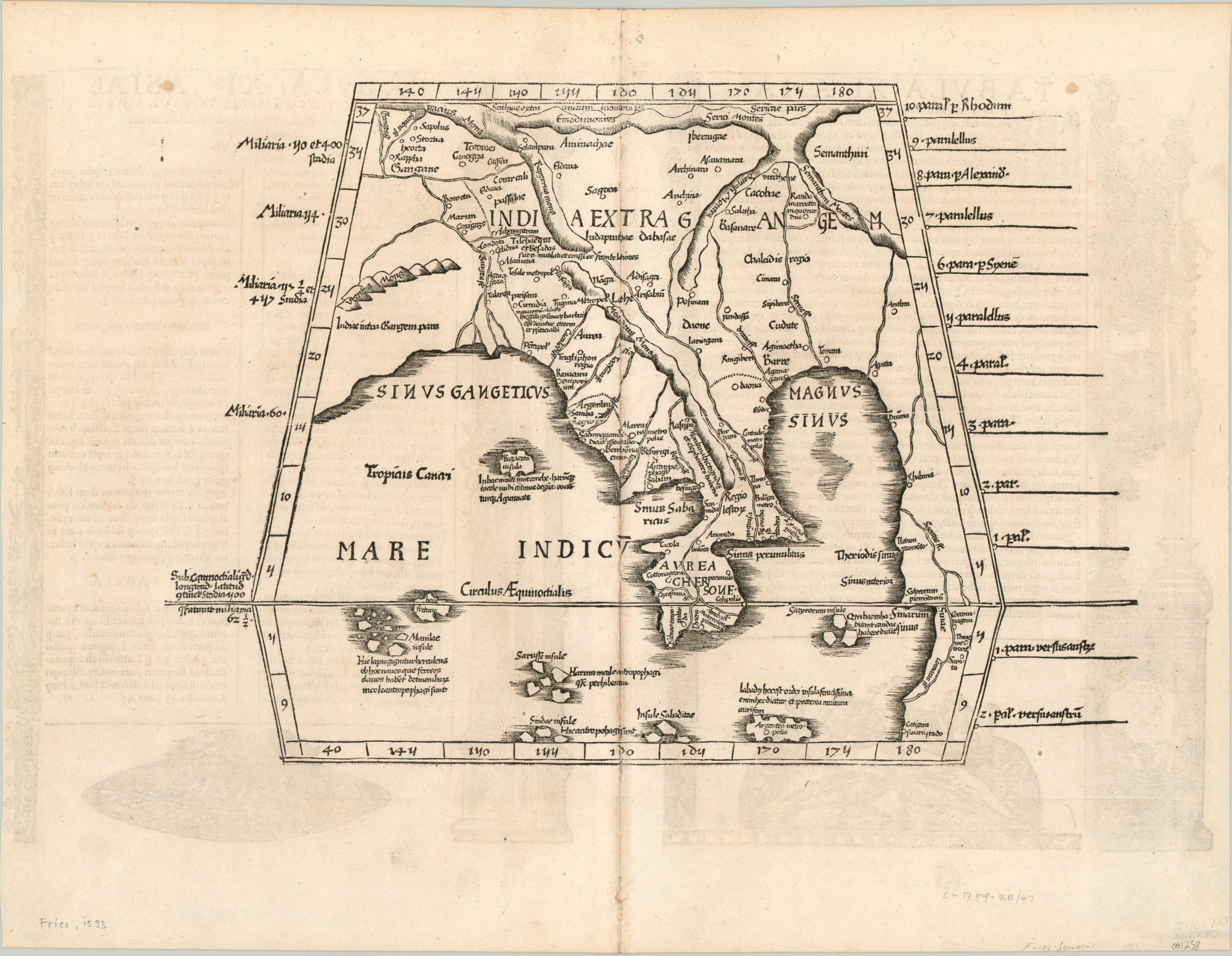 This fascinating map of southeast Asia shows the regional geography between the Bay of Bengal (Sinus Gangeticus) and South China Sea (Magnus Sinus) according to the second century Greek scholar Claudius Ptolemy. The landmass extending south along the right side of the sheet perpetuated a Ptolemaic belief that the Indian Ocean was landlocked!
