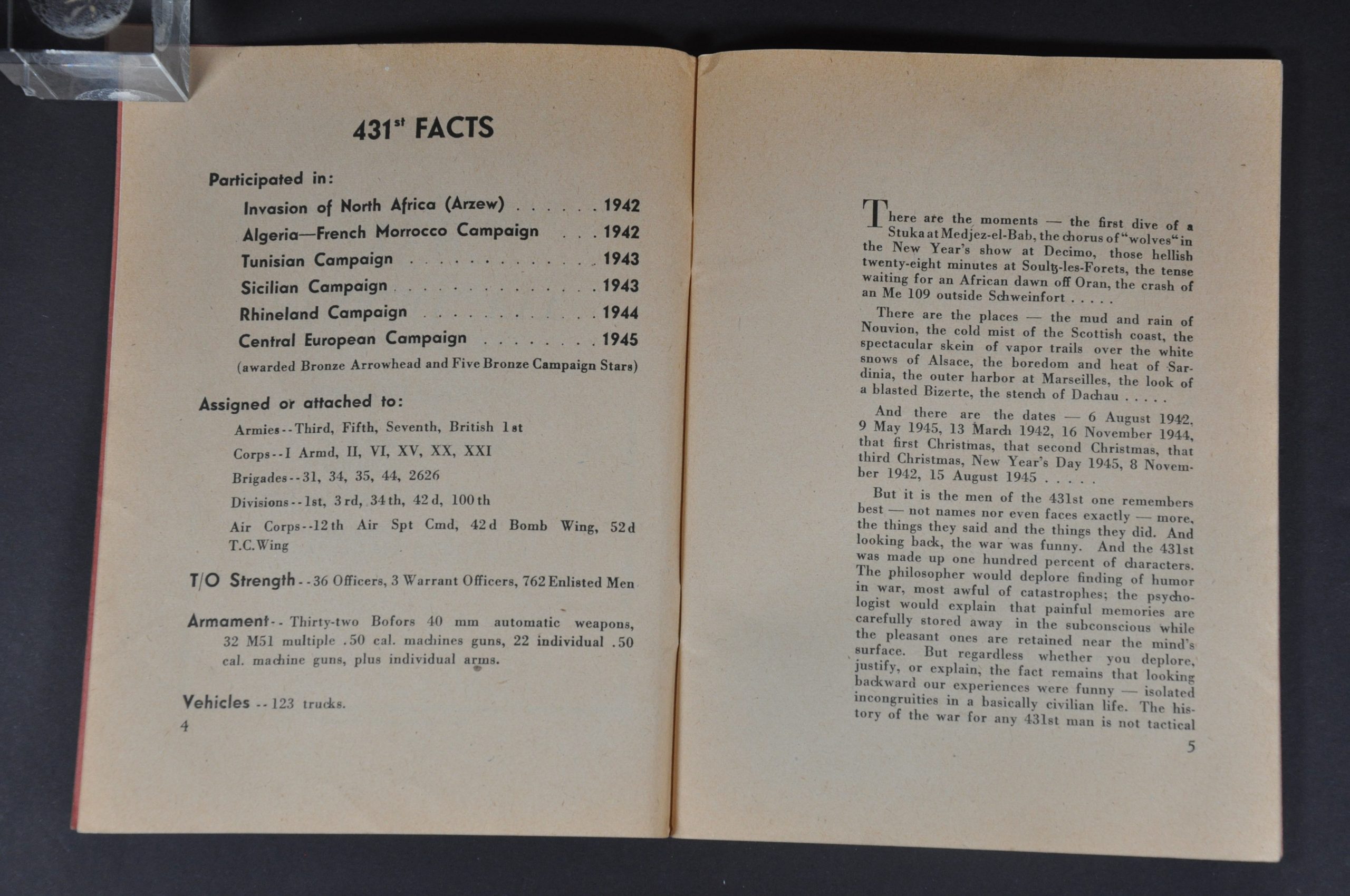This fascinating and uncommon booklet was published in Bad Reichenhall, Germany by Wiedemannsohe Buchdruckerei in 1945. It was issued to commemorate the efforts of the 431st Anti Aircraft Automatic Weapons Battalion (Mobile) during the European Theater of Operations in World War II.