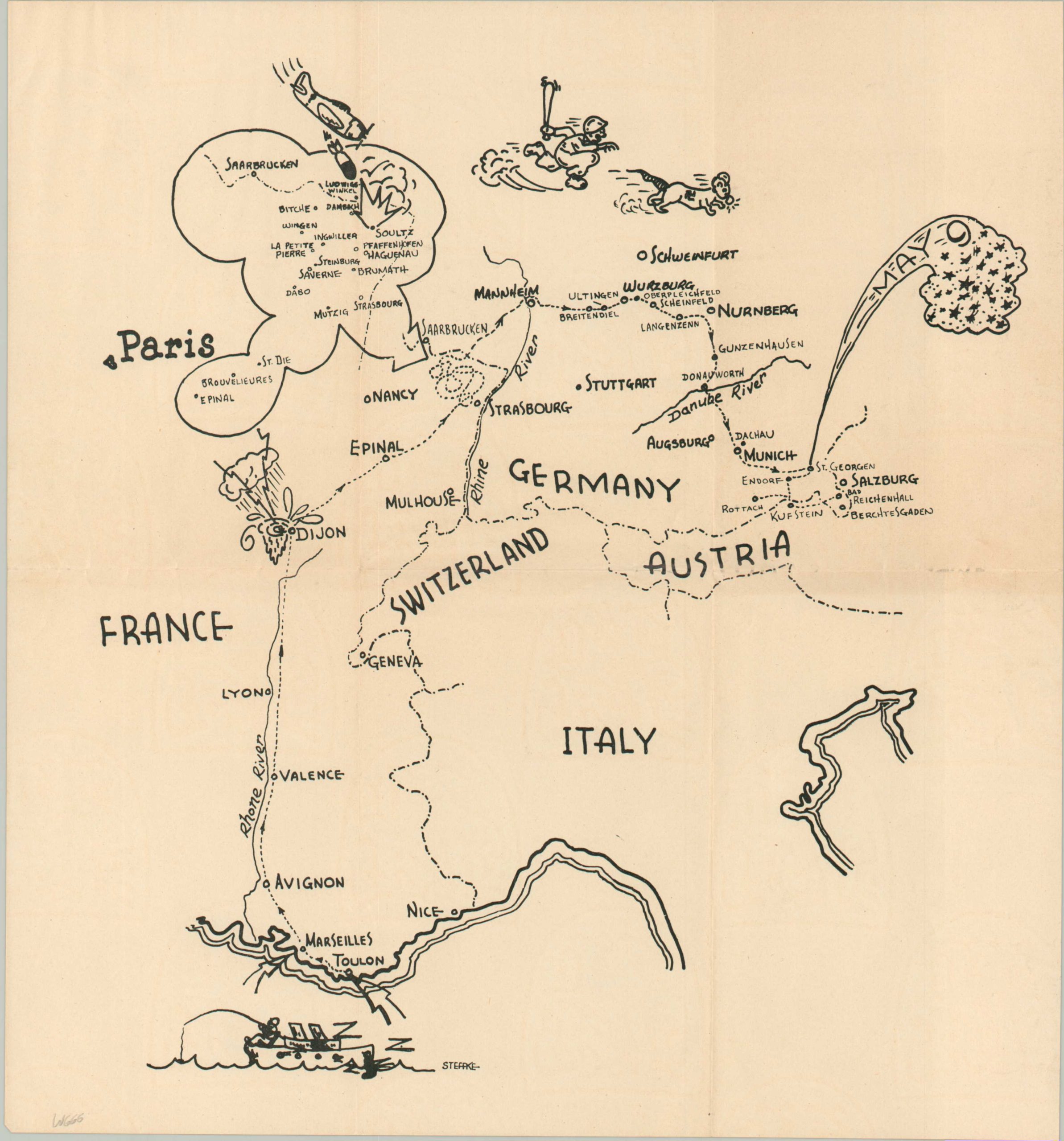 Over sixty pages of text summarize the notable events and various engagements that took place from training in Georgia and England to victorious campaigns in North Africa, Italy, and southern France. It concludes with V-J Day and the following moving excerpt;