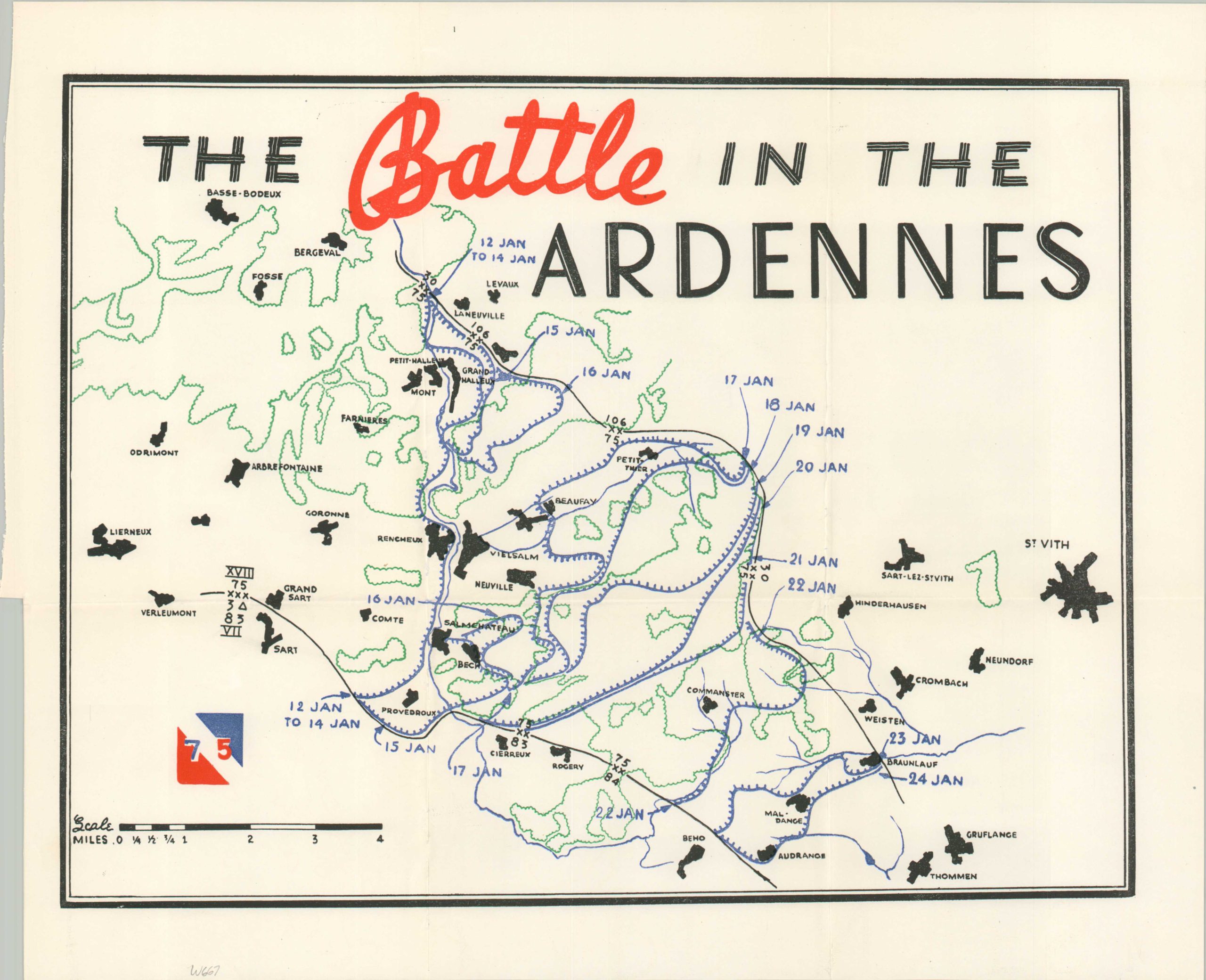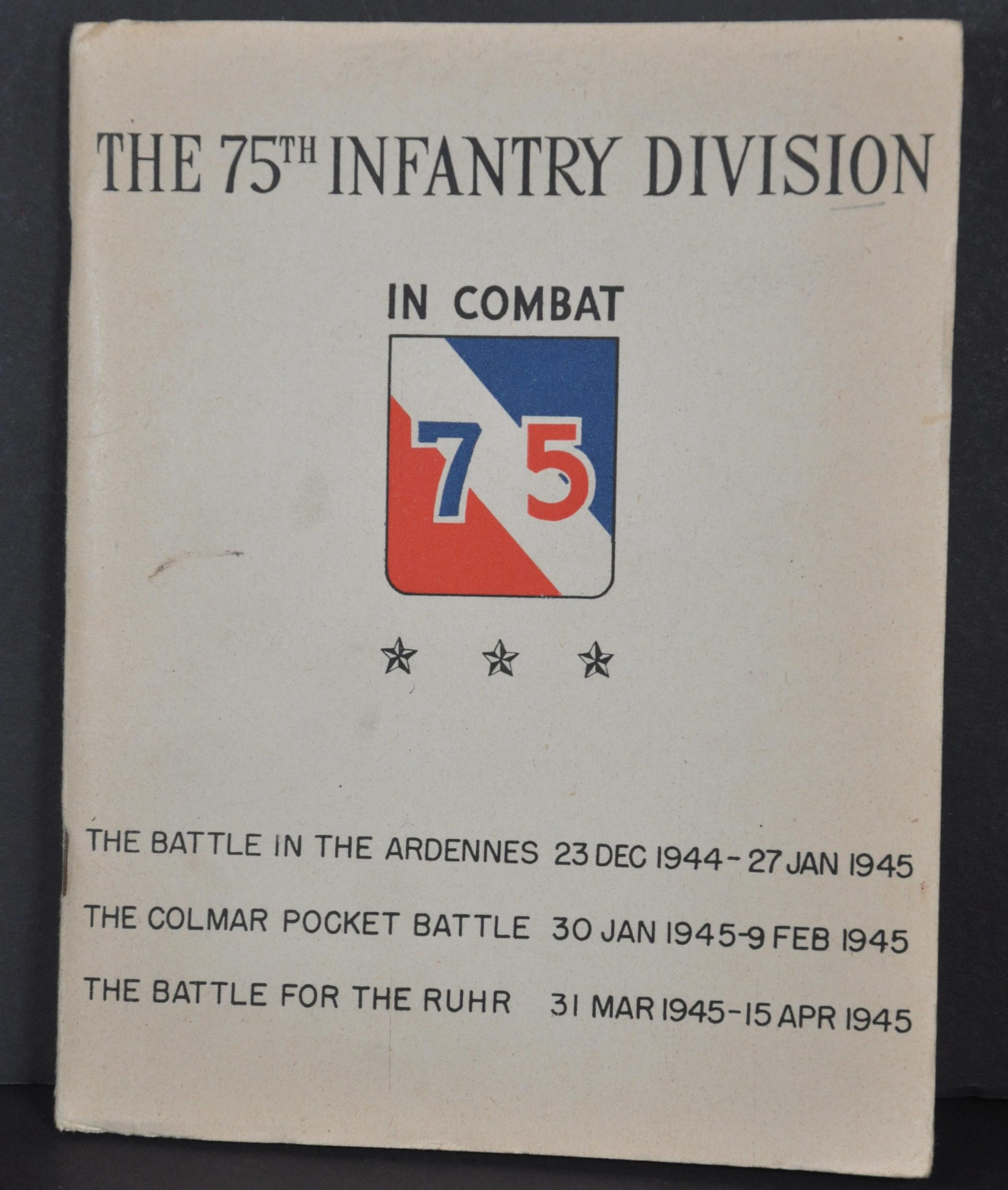 During this brief period, the 75th was rushed into combat to support beleaguered units during the Battle of the Bulge, aided in the liberation of Colmar, crossed the Rhine River, and fought in the Vosges Mountains. Forty-five pages of text summarize the major actions that took place across an impressive campaign. The booklet includes three folding maps that highlight the unit’s most exemplary accomplishments – The Battle in the Ardennes, the Colmar Pocket, and The Battle for the Ruhr.