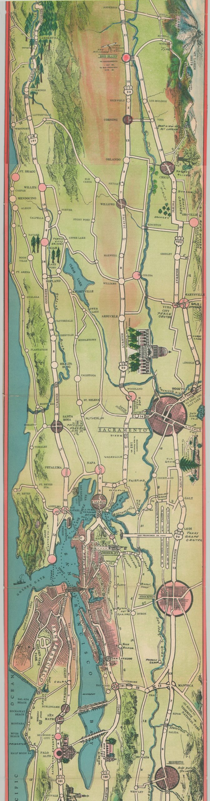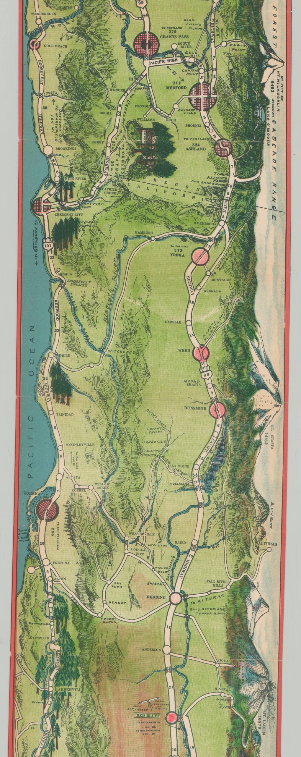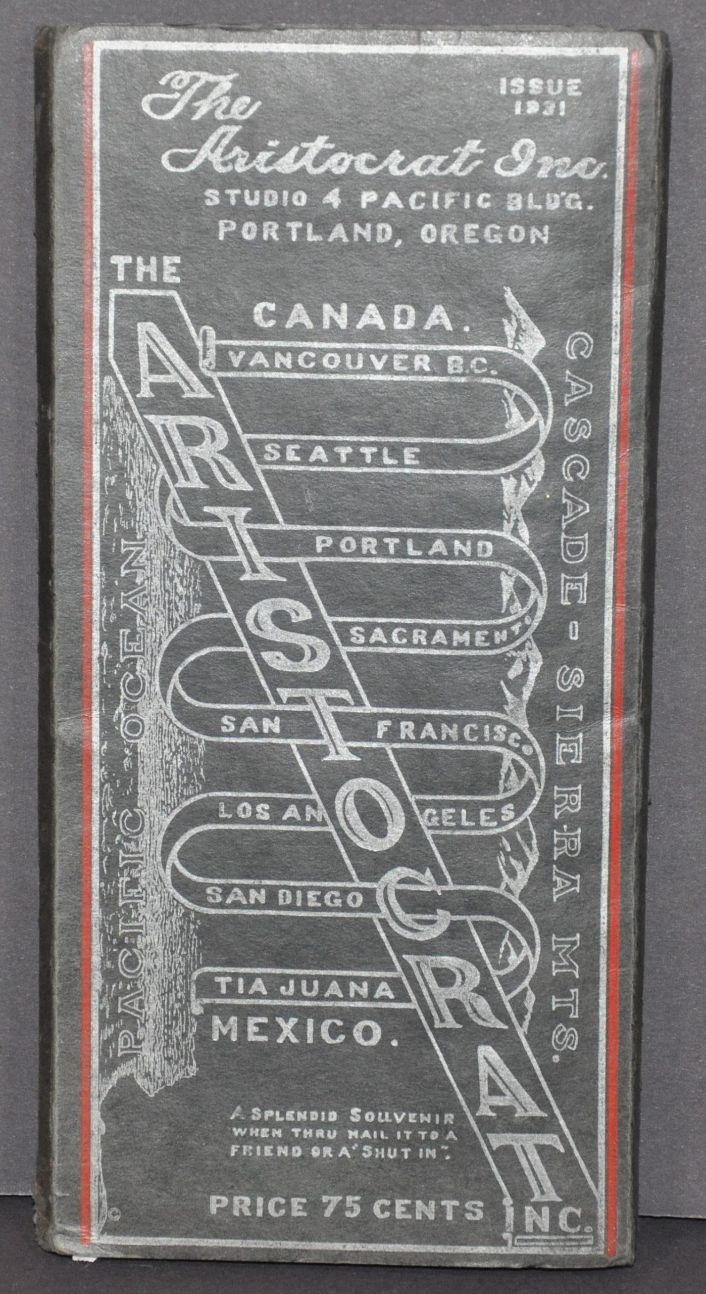 This incredibly long strip map – nearly 16 feet in length – was published in 1931 in Portland, Oregon by the Aristocrat, Inc. According to the verso of the sheet, the firm’s name “seemed to be the best existing word to describe our ideals…We aim to produce the best that is possible in road maps, aristocrats of the road map publications.” For a mere 75 cents (no small change in the midst of the Great Depression), one could purchase an incredible keepsake that covers the primary highway routes along the West Coast of North America between Vancouver in British Columbia and Tijuana, Mexico, and from the Pacific Ocean to the Cascade-Sierra Range. Although instructions for use are provided while on the road (risky, perhaps?), the impressive compilation was also suitable as “a splendid souvenir when thru mail it to a friend or ‘shut in’, according to the front cover.