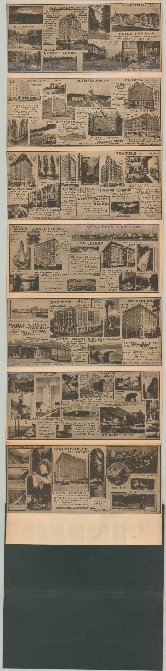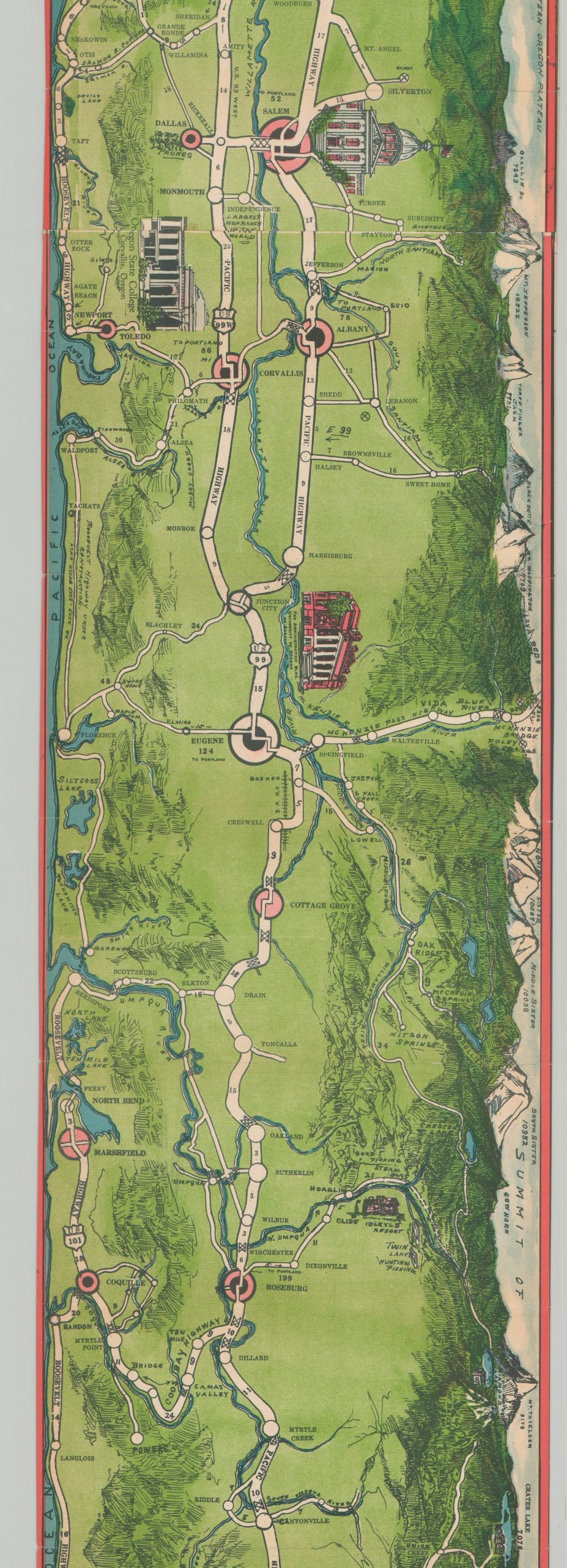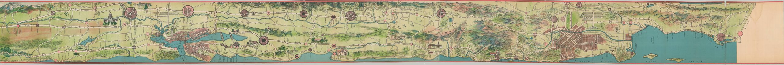 This incredibly long strip map – nearly 16 feet in length – was published in 1931 in Portland, Oregon by the Aristocrat, Inc. According to the verso of the sheet, the firm’s name “seemed to be the best existing word to describe our ideals…We aim to produce the best that is possible in road maps, aristocrats of the road map publications.” For a mere 75 cents (no small change in the midst of the Great Depression), one could purchase an incredible keepsake that covers the primary highway routes along the West Coast of North America between Vancouver in British Columbia and Tijuana, Mexico, and from the Pacific Ocean to the Cascade-Sierra Range. Although instructions for use are provided while on the road (risky, perhaps?), the impressive compilation was also suitable as “a splendid souvenir when thru mail it to a friend or ‘shut in’, according to the front cover.