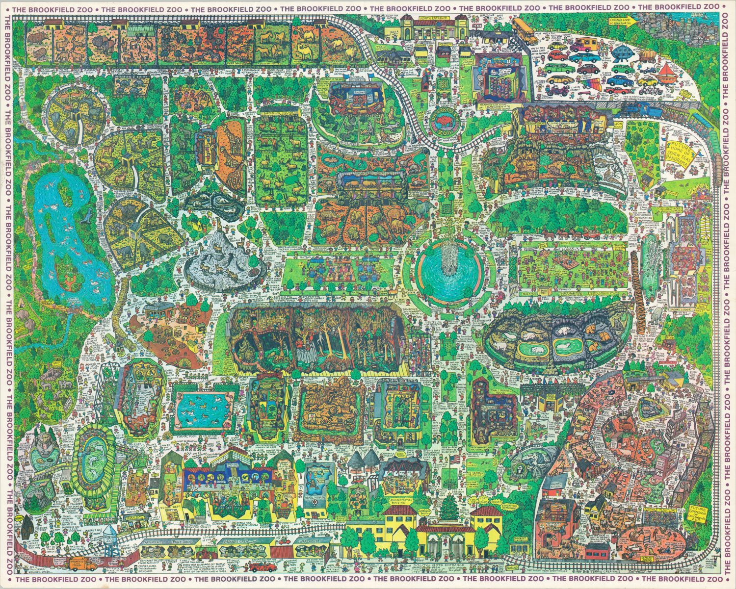 This commemorative poster map of the zoo was designed by Bob Terrio and published in 1984 – fifty years after the doors first opened to the public (though the exact date is apparently in dispute and is listed as July 1st). Although the basic layout remains largely the same, significant changes had taken place in the intervening five decades and are captured within the image.
